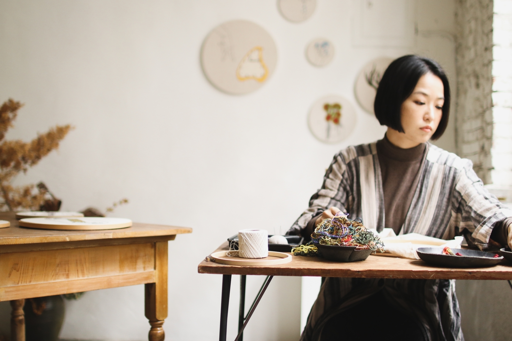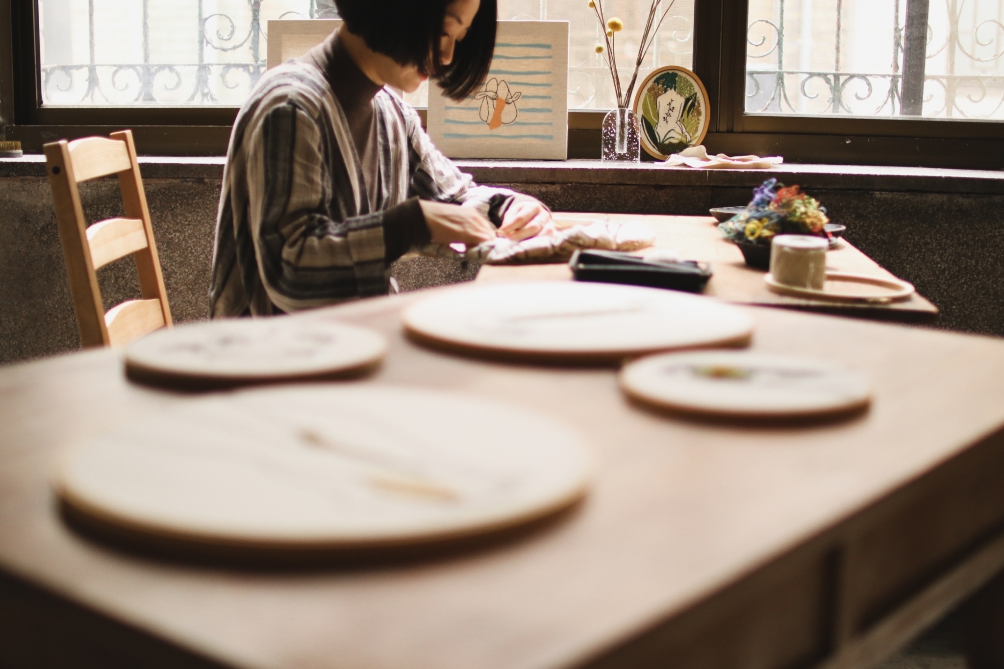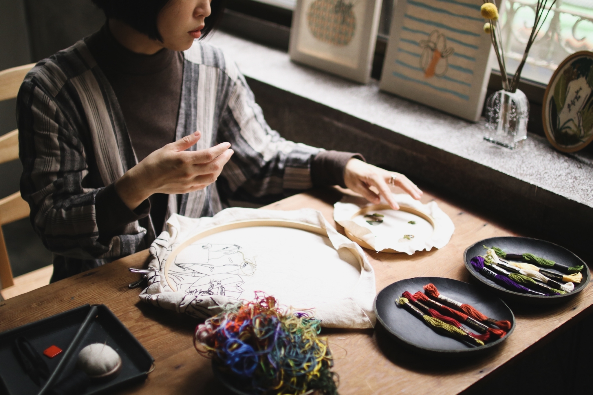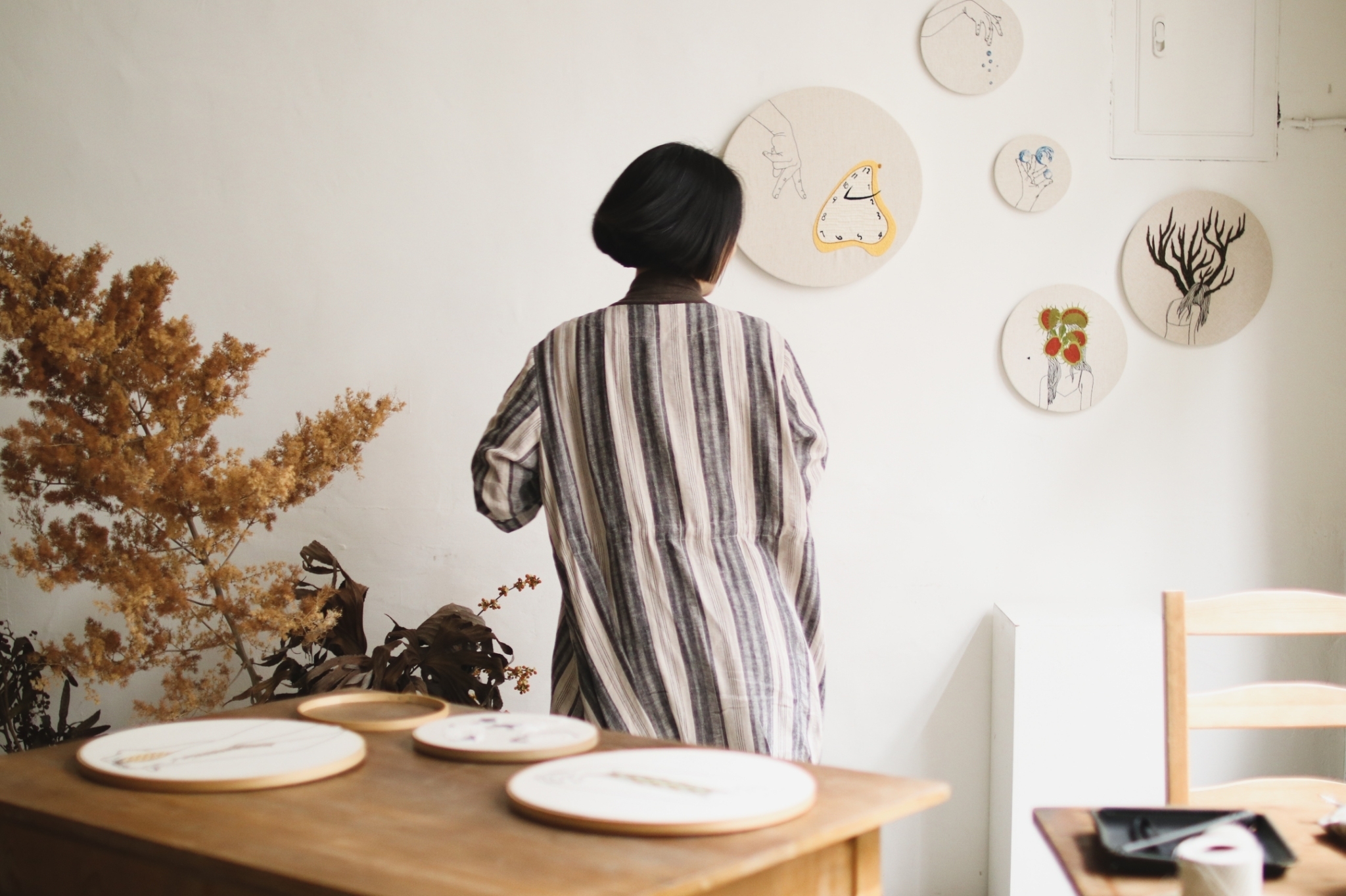 刺繡藝術家 Fxiii 隨意的將作品與工具放在工作桌上與窗邊,再將幾幅圓形的作品掛上牆面,被繡框圈起的超現實畫作彷彿現代詩中的標點符號,每個休止間,都有未盡的故事。