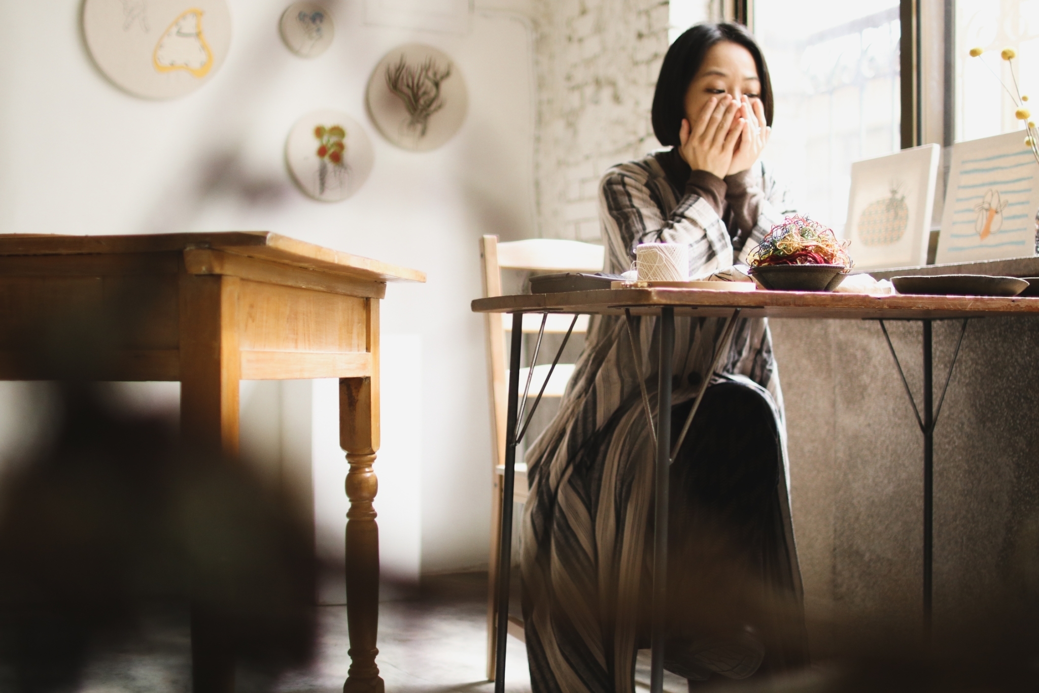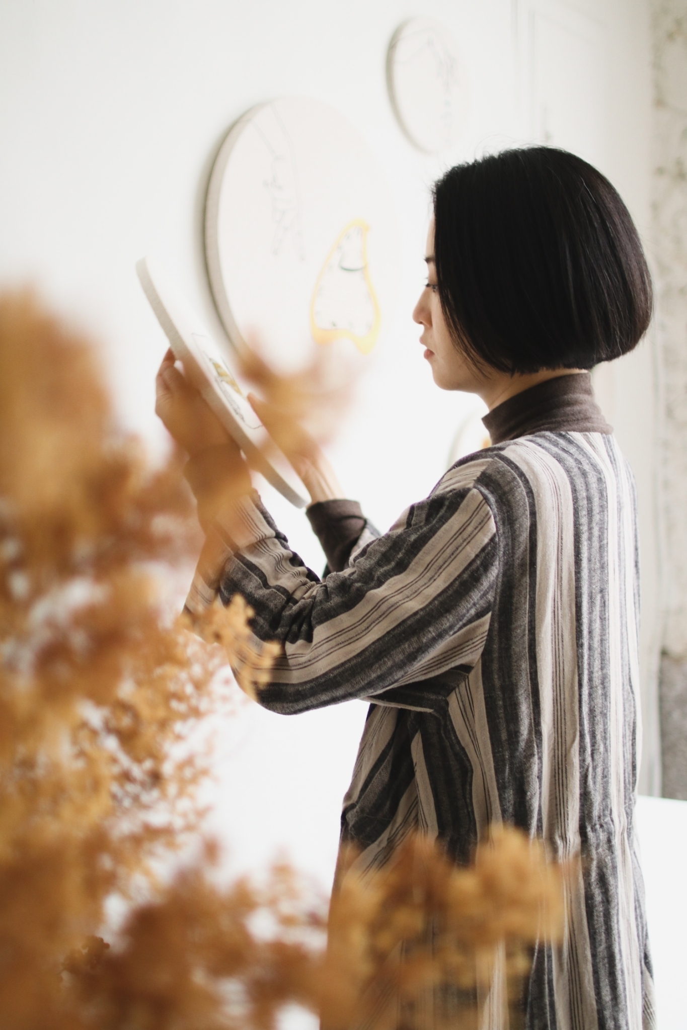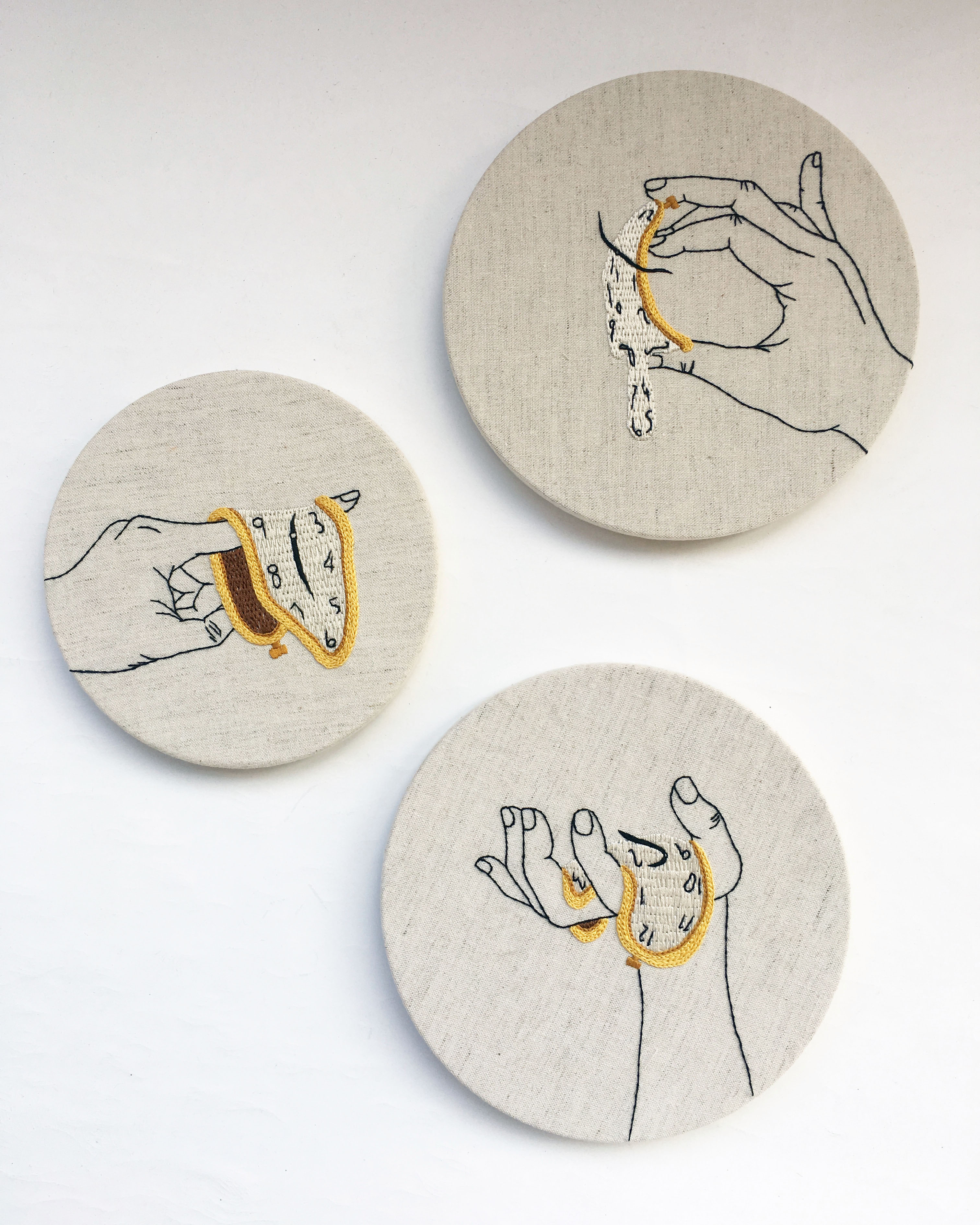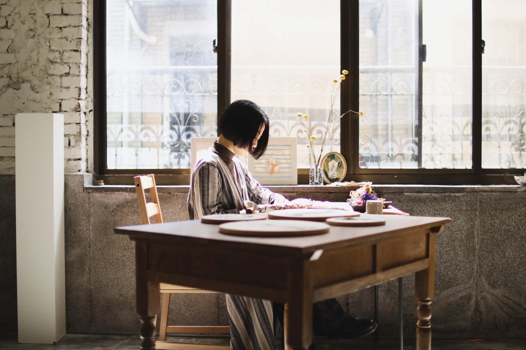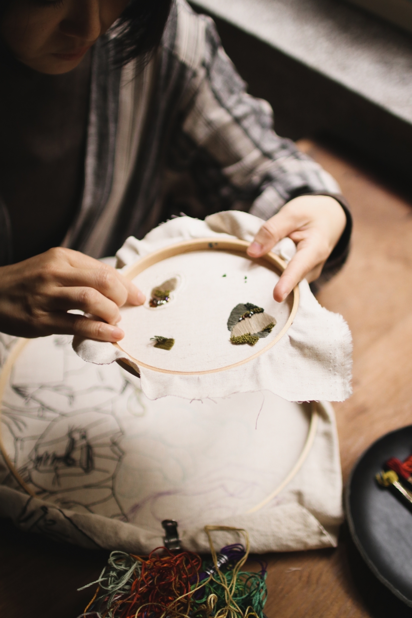 刺繡藝術家 Fxiii 隨意的將作品與工具放在工作桌上與窗邊,再將幾幅圓形的作品掛上牆面,被繡框圈起的超現實畫作彷彿現代詩中的標點符號,每個休止間,都有未盡的故事。