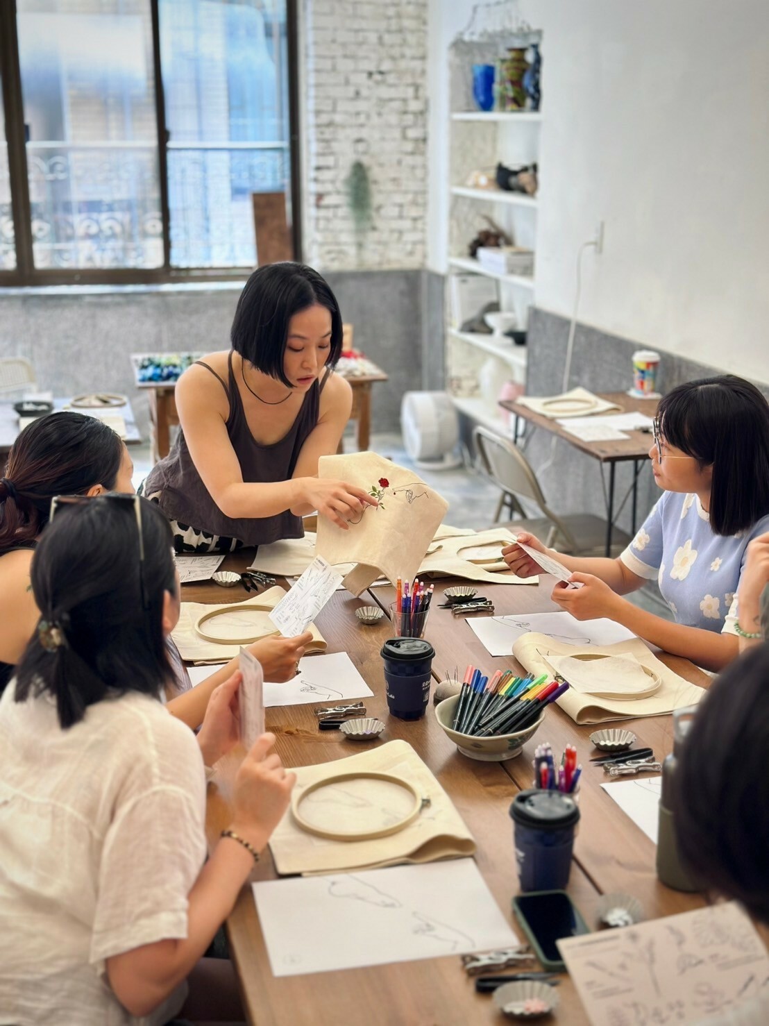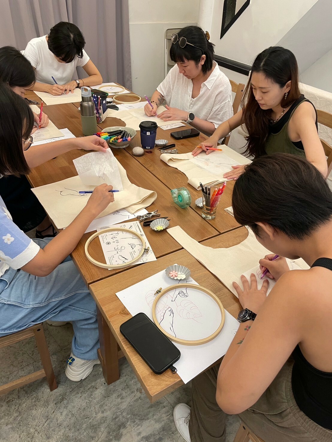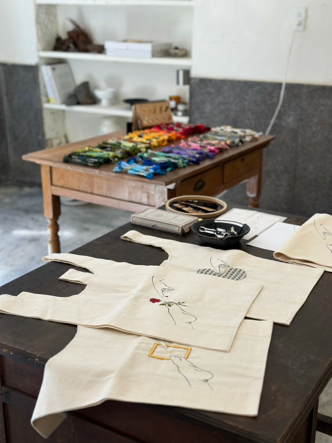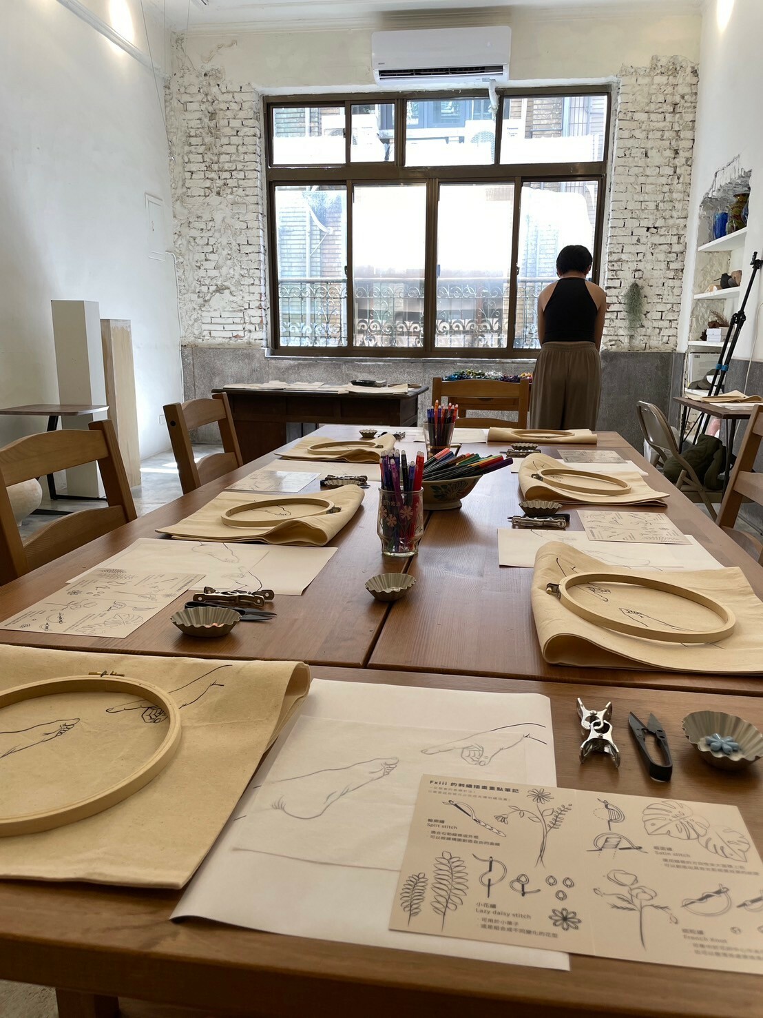 刺繡藝術家 Fxiii 隨意的將作品與工具放在工作桌上與窗邊,再將幾幅圓形的作品掛上牆面,被繡框圈起的超現實畫作彷彿現代詩中的標點符號,每個休止間,都有未盡的故事。