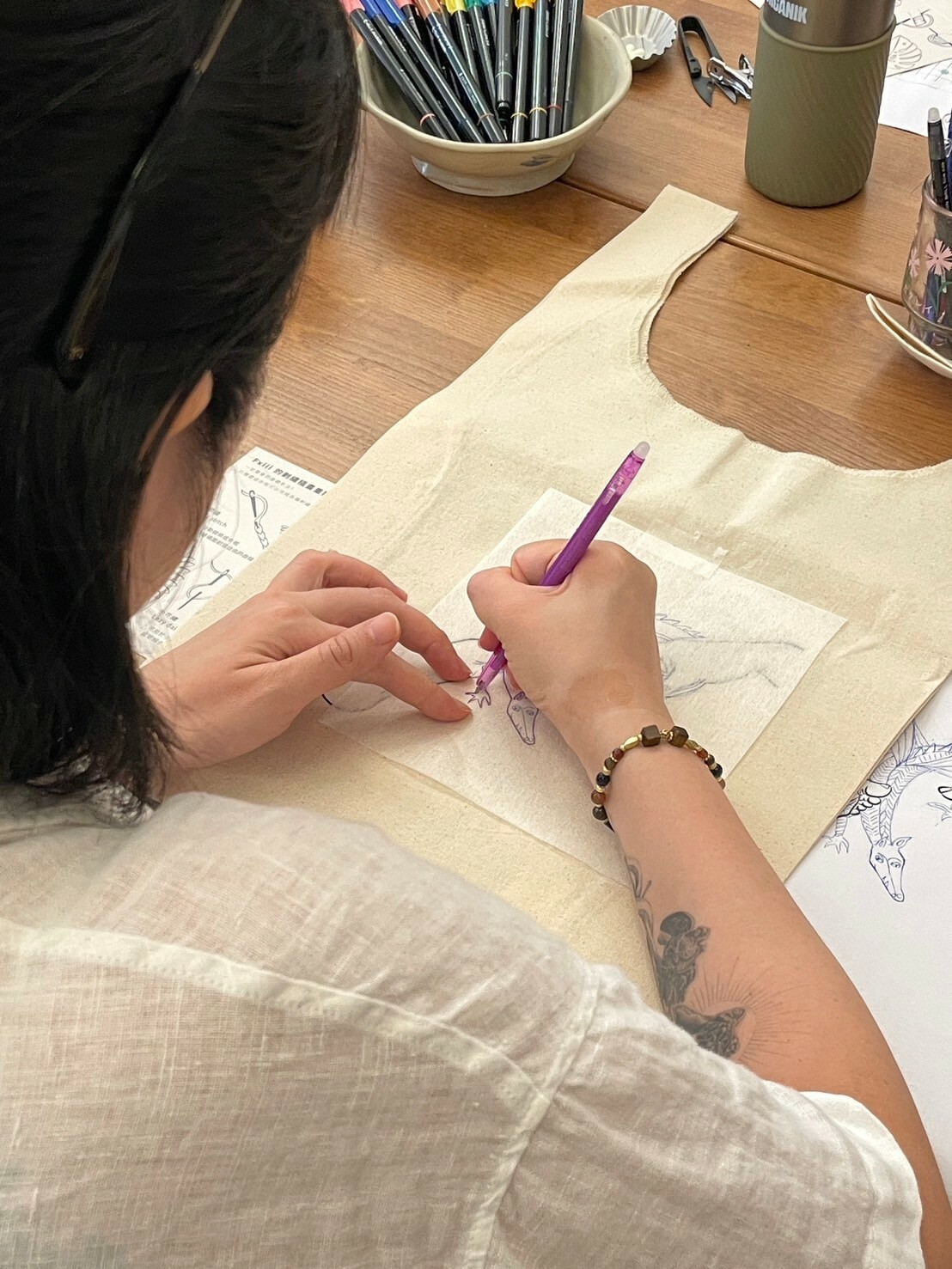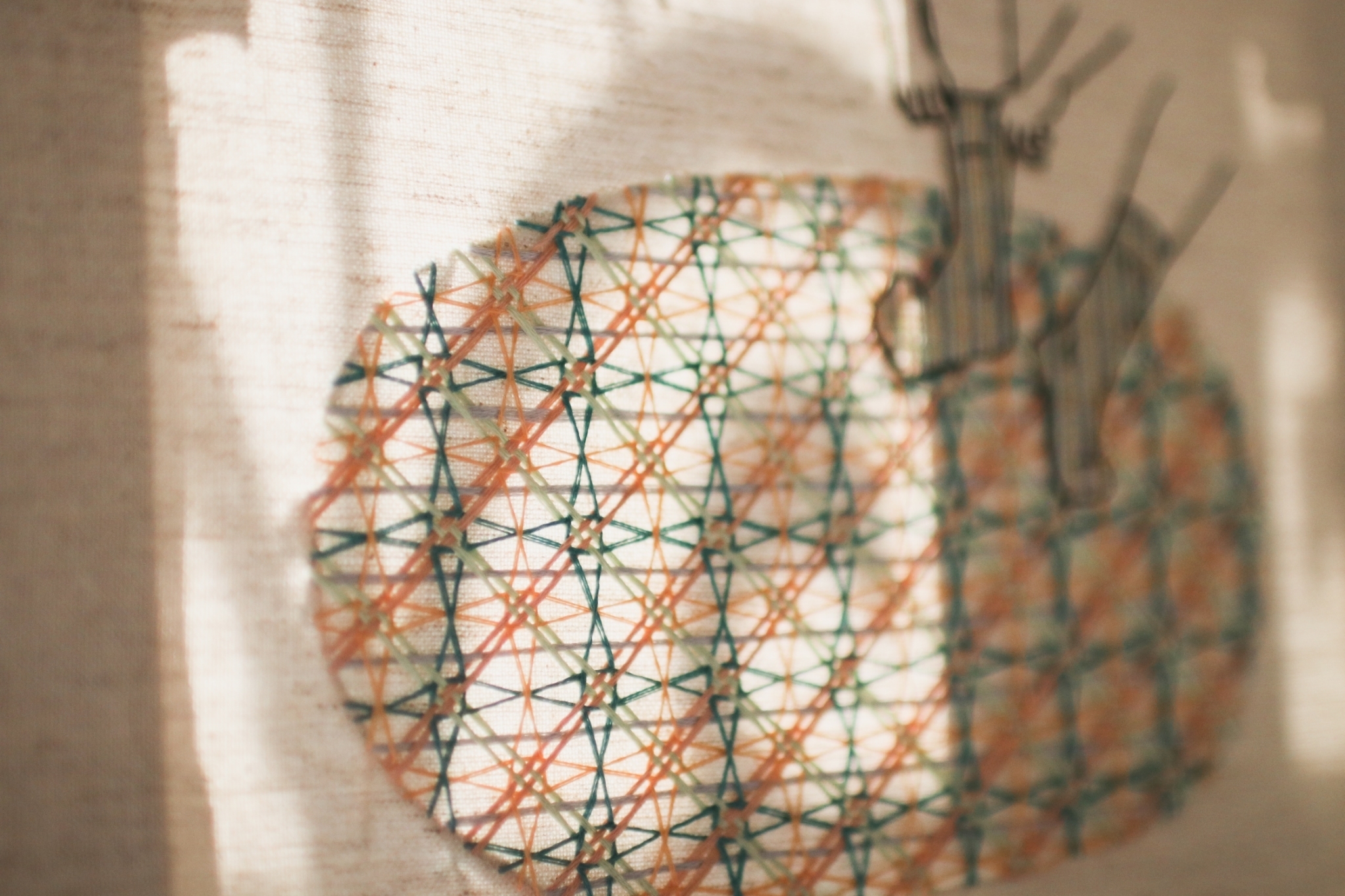 創作可以選用的媒材有很多,普遍都會需要紙、筆、顏料、還會需要一張可以放這些東西的桌子。我一開始也只是單純的想畫畫而已,但想到要處理顏料什麼的總覺得好麻煩,最後草稿就閒置了(還閒置多年),某天經過大稻埕的布市時突然靈機一動,線不會乾掉,也不會沾得到處都是,布的紋理跟紙類似,但不怕折到也不一定要好好的攤平在桌上,那不如把線縫在布上畫畫看吧。