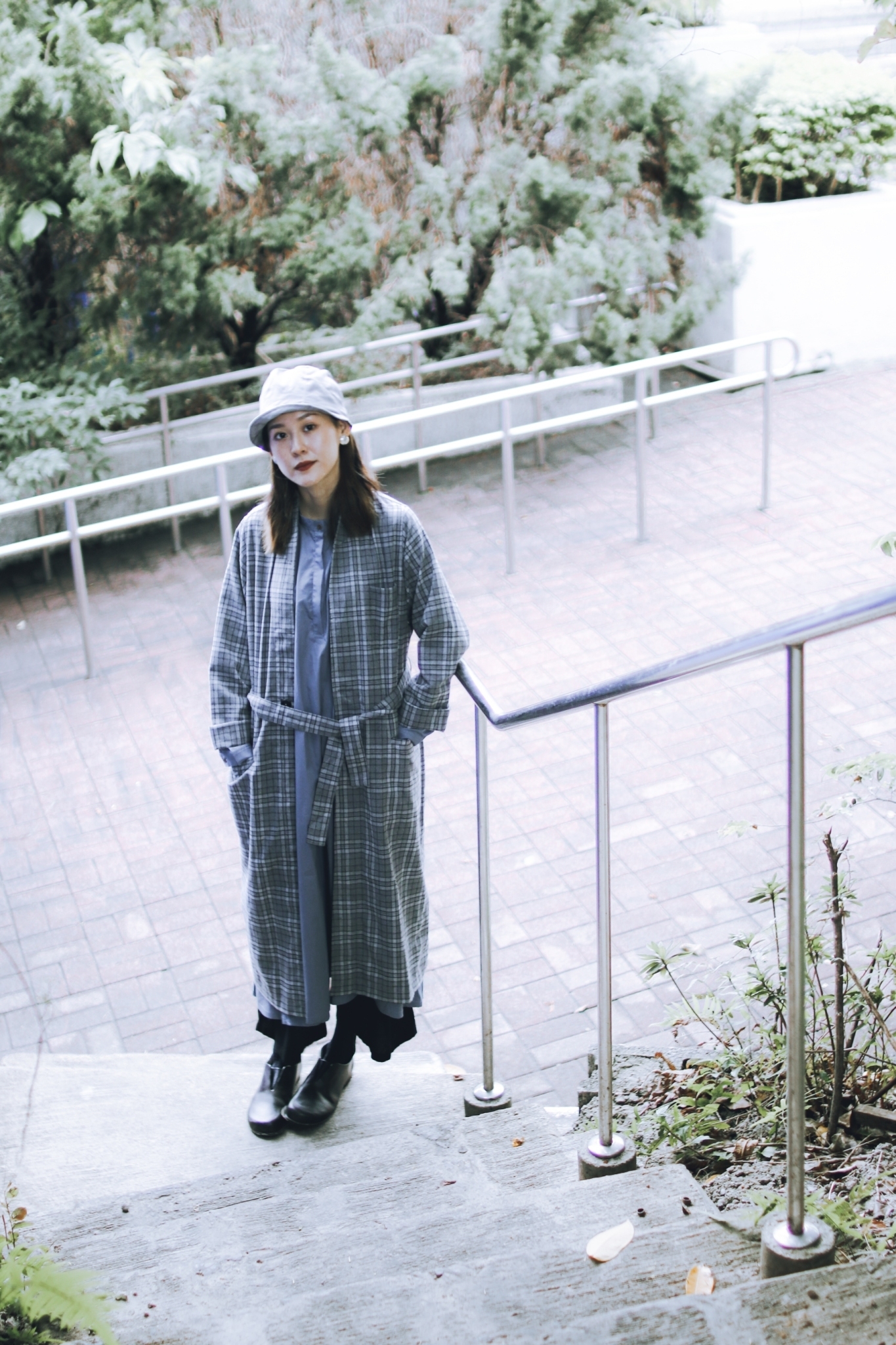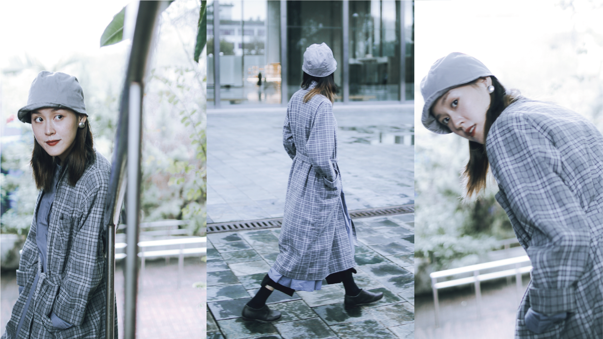 慵懶風格的柔軟長袍式大衣,適合一日的城市小旅行,古典的格紋與俏皮現代感的帽子相互平衡,呈現俐落又灑脫的氛圍。