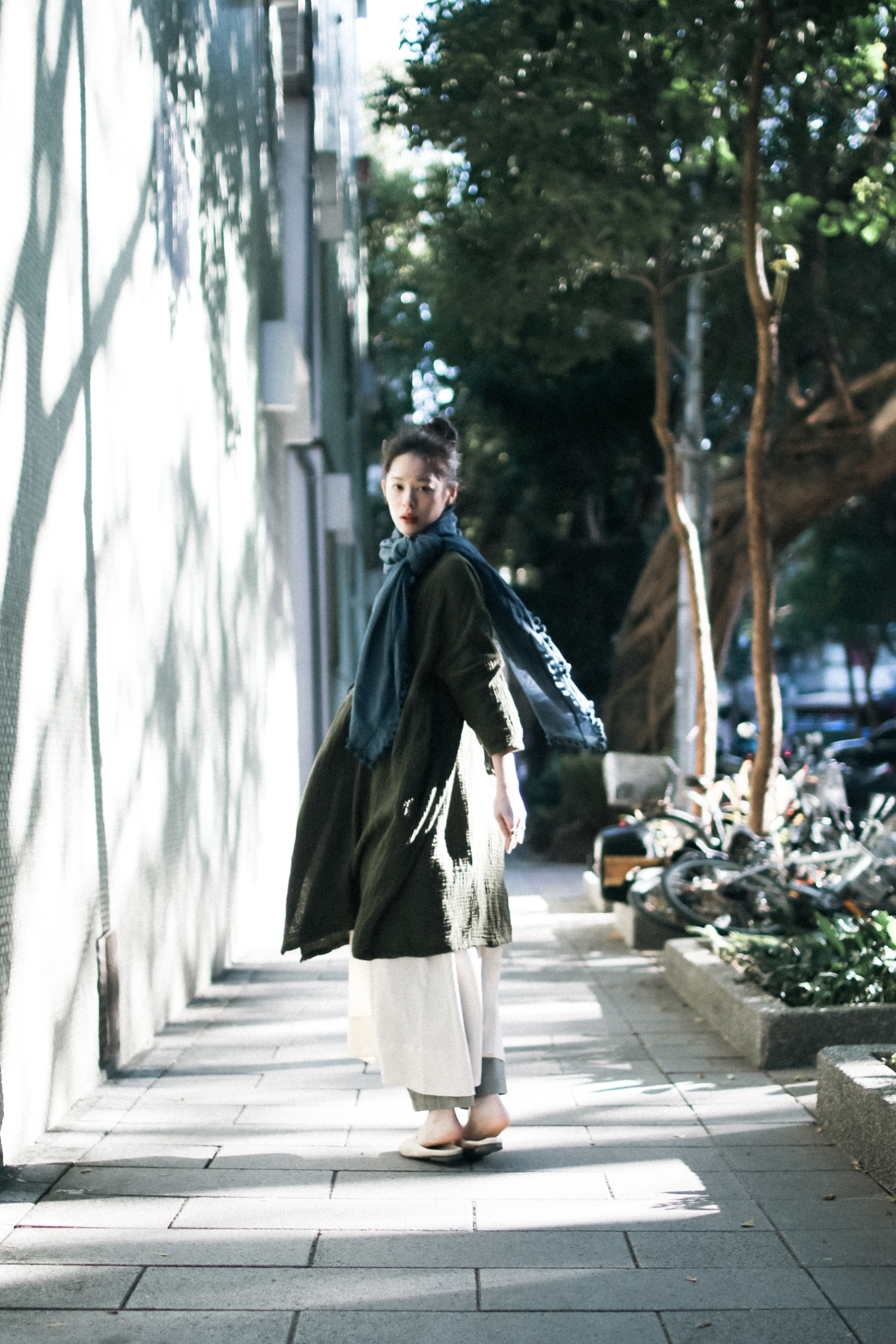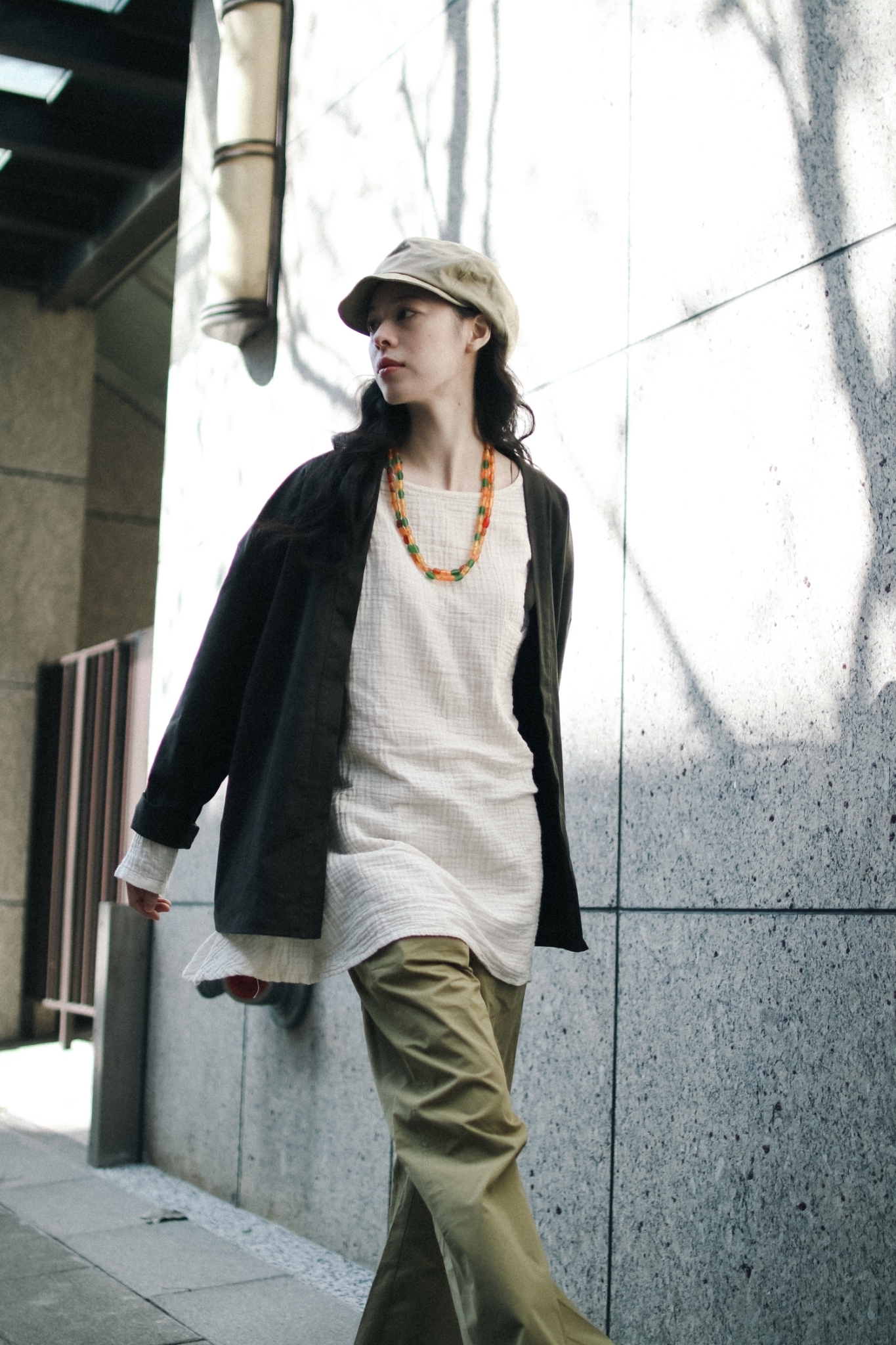 自然風格的綠色調是最容易日常搭配的彩色,以寬鬆的長版外套跟長版洋裝作搭配,再以長褲作為最後收斂,讓整體比例自然拉長,行走間優遊自在。