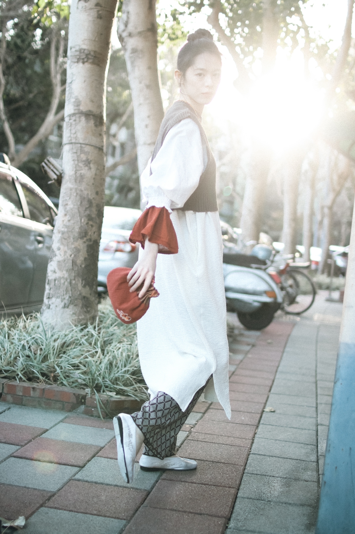 富設計感的One piece搭配短版針織背心與針織長褲,適合不想穿外套的微涼天氣,小面積的點綴橘紅,讓沈澱許久的心情跟著漸暖的天氣一同甦醒。