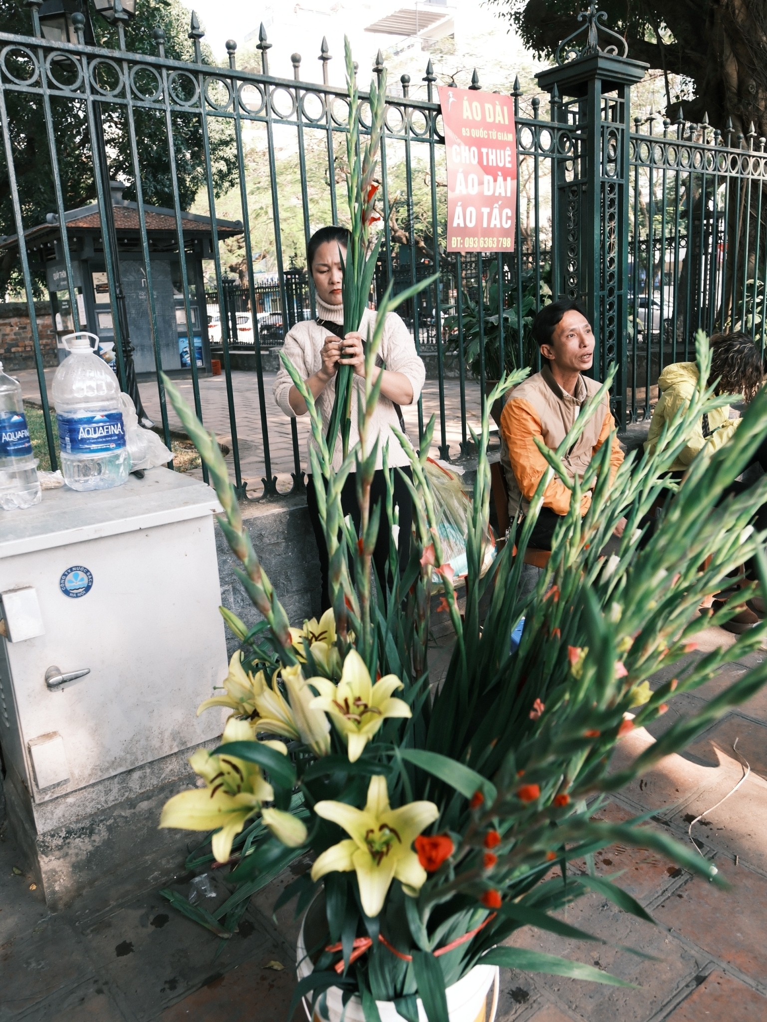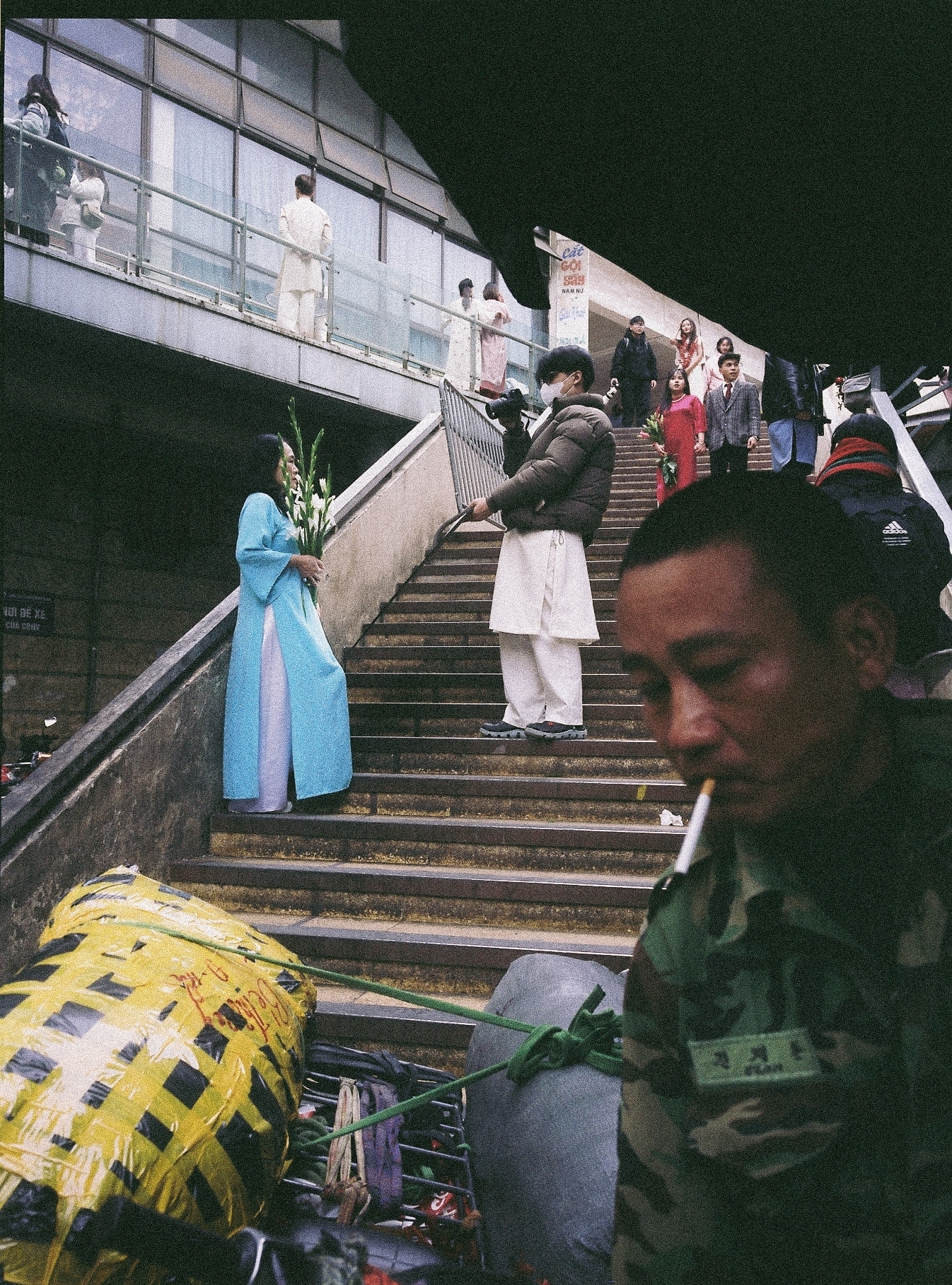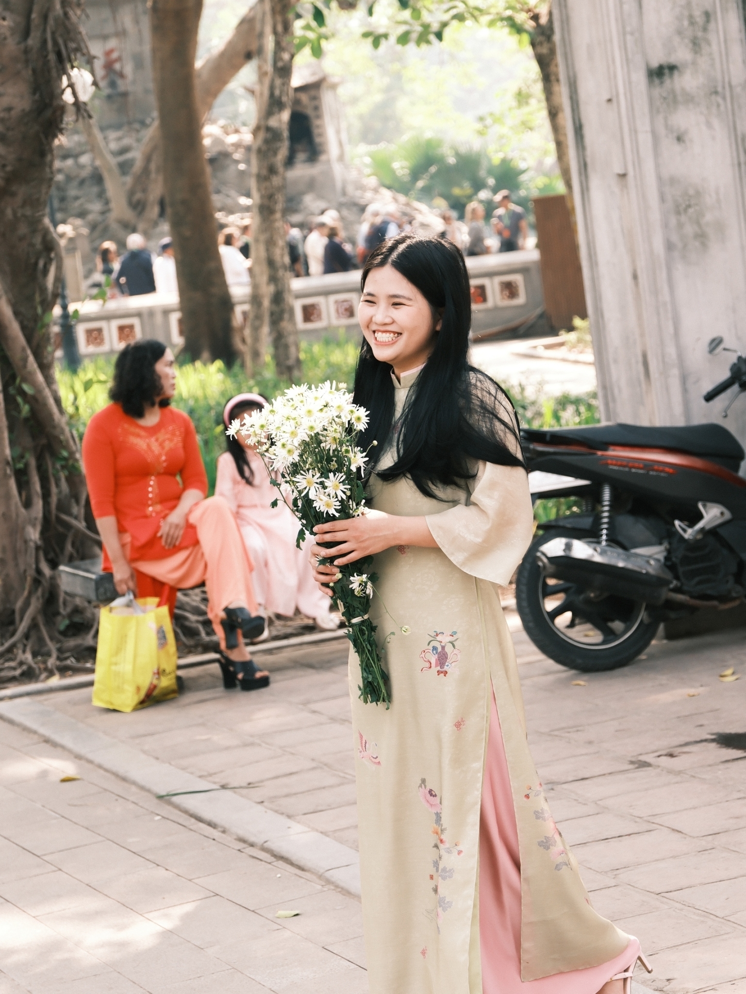 週末的廣場上播著西洋流行音樂,有隨著音樂起舞的國標舞者,也有沈浸在太極世界的人在練拳;穿著傳統奧黛的學生們拿著新型手機互相擺拍,餓了就跟戴著斗笠背著扁擔的小販買零食。