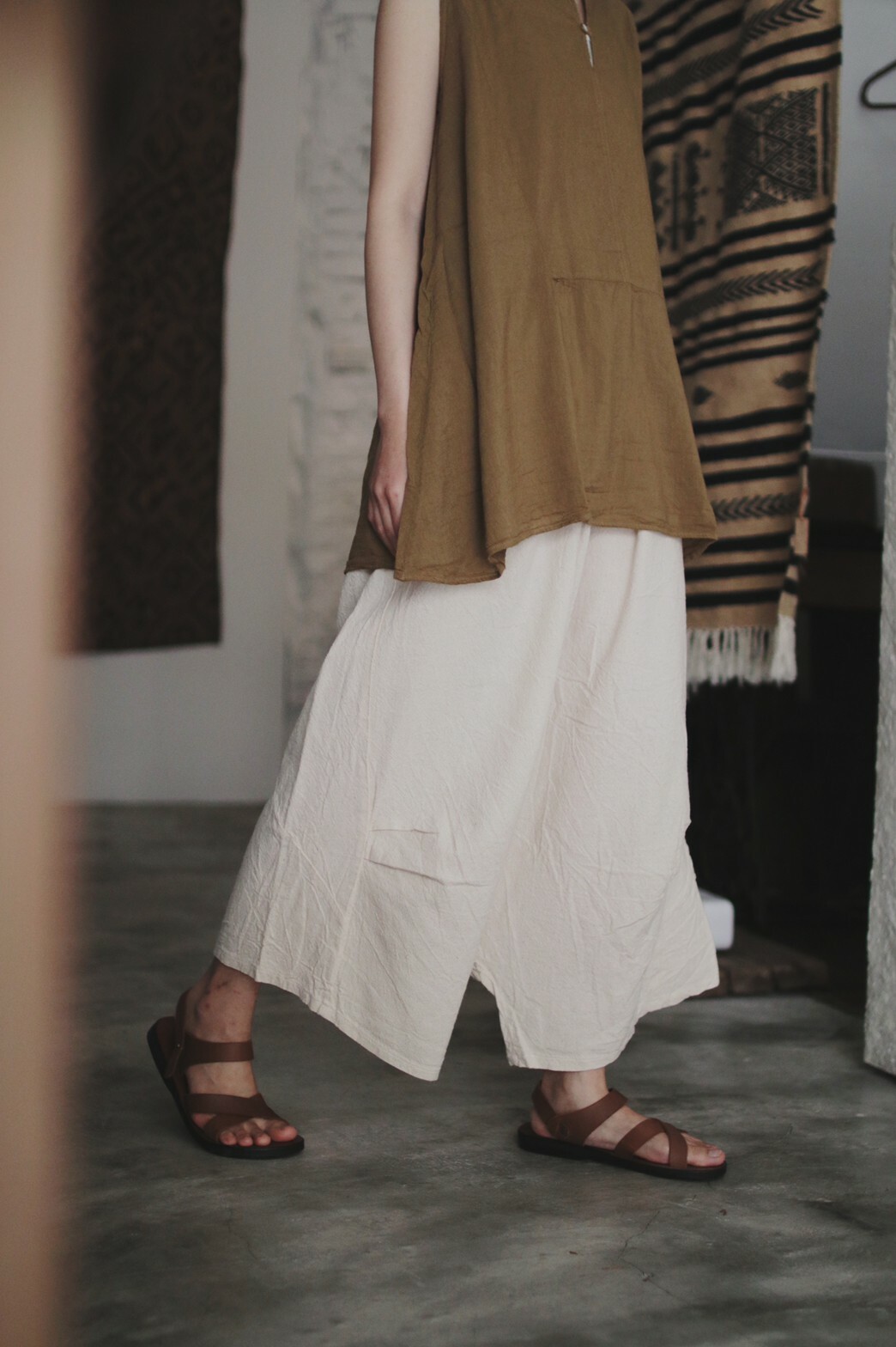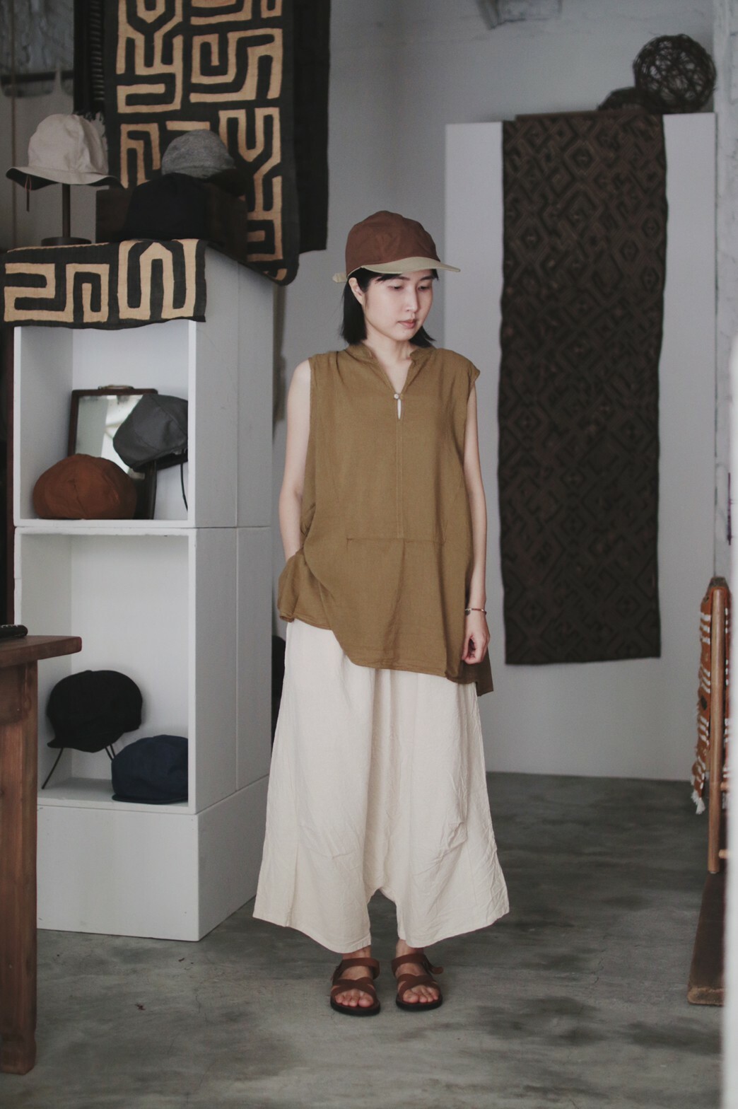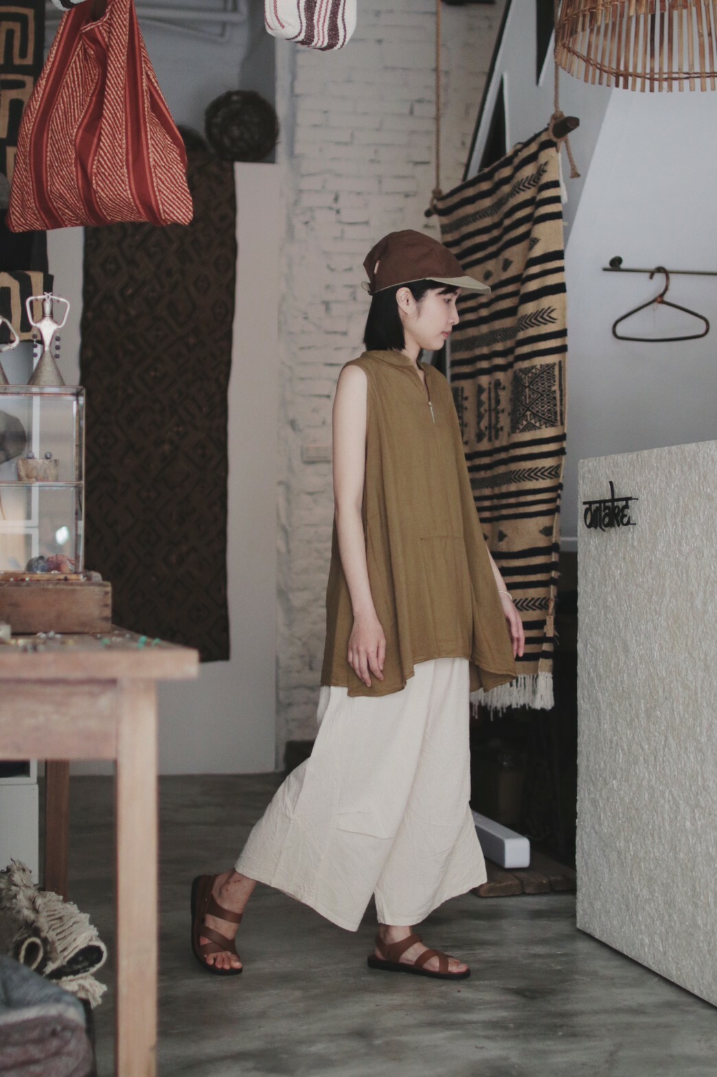 土黃色的傘狀長版背心搭配米白色低檔寬褲,故意打破的身形結構呈現出的1:1的比例,俏皮且可愛。