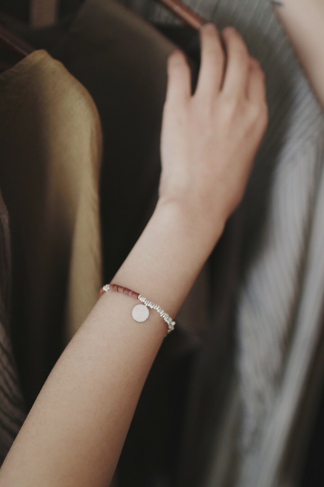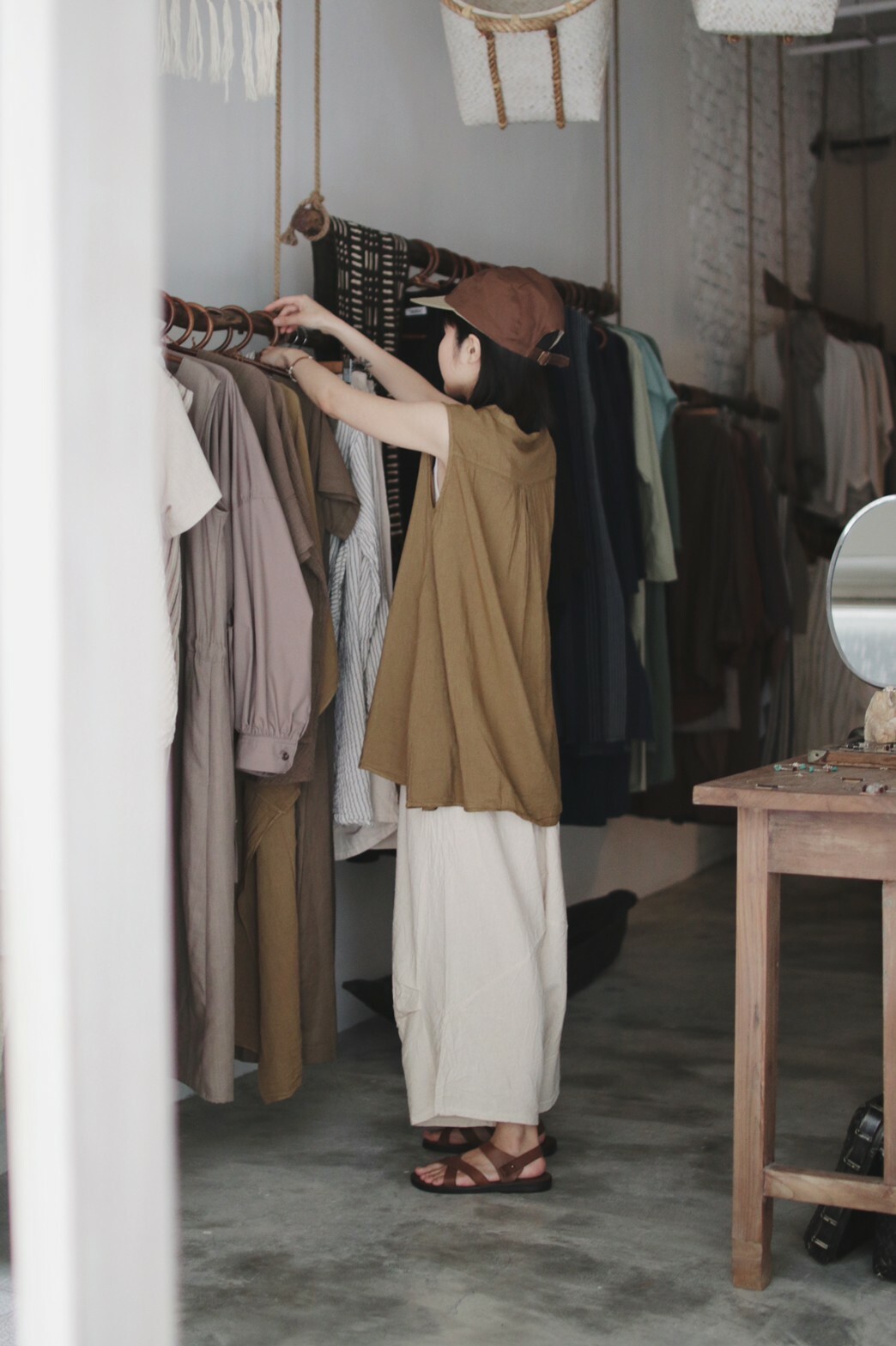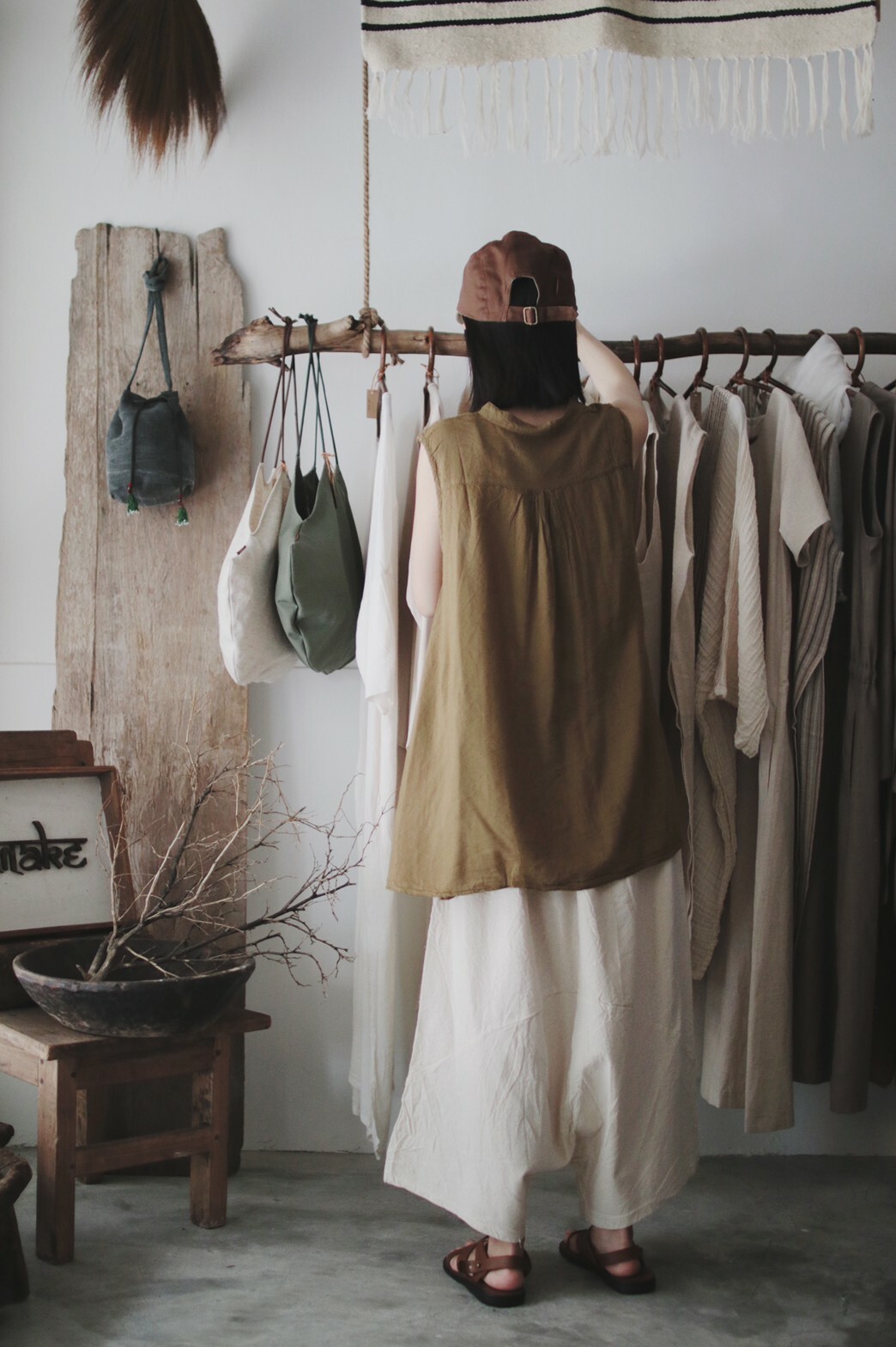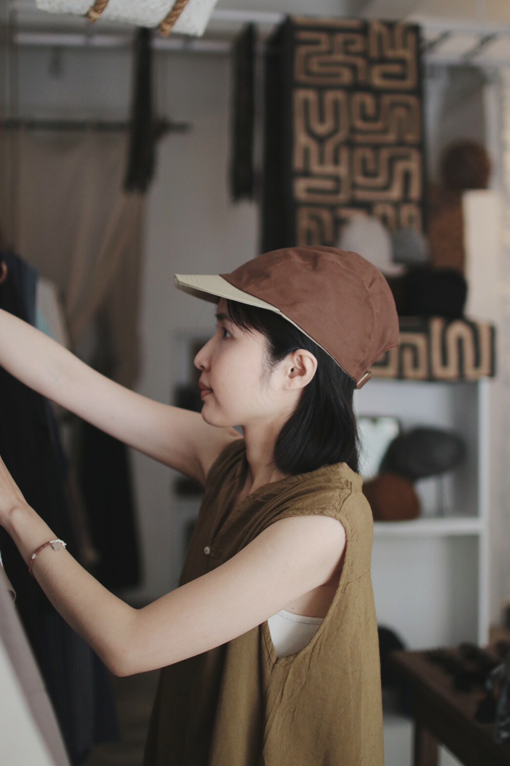 最後點綴深褐色帽子、棕色皮涼鞋、與大地質感的陶珠純銀飾品,讓整體更有層次,適合活潑中性的風格。