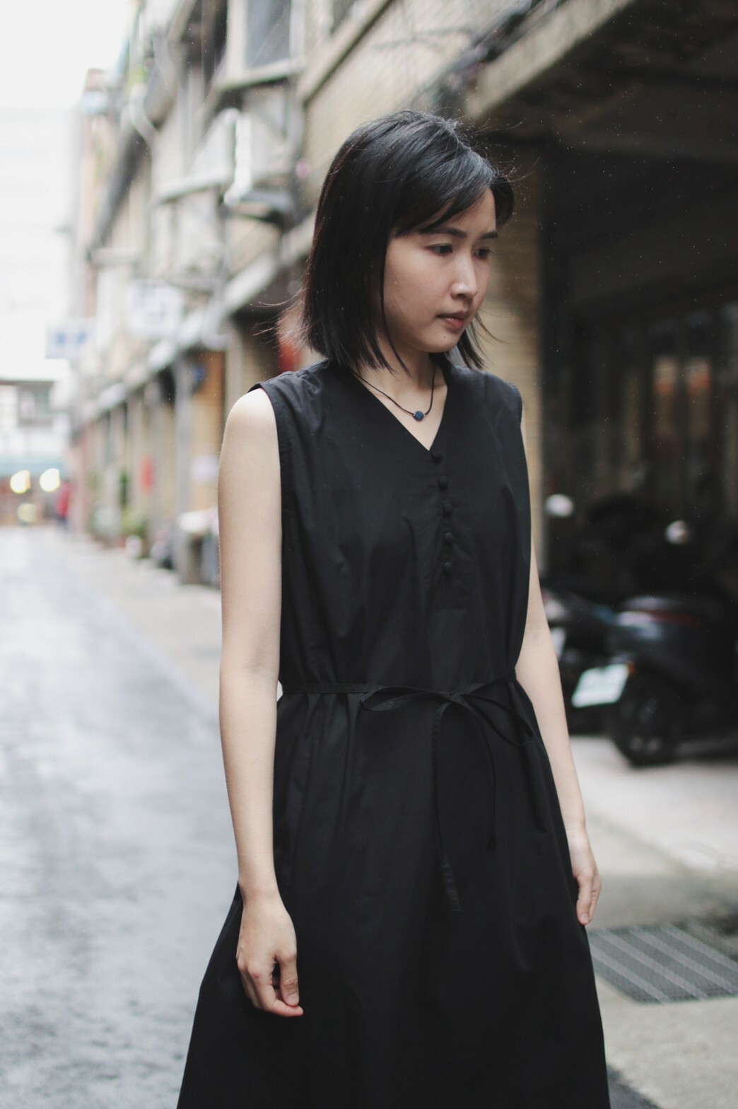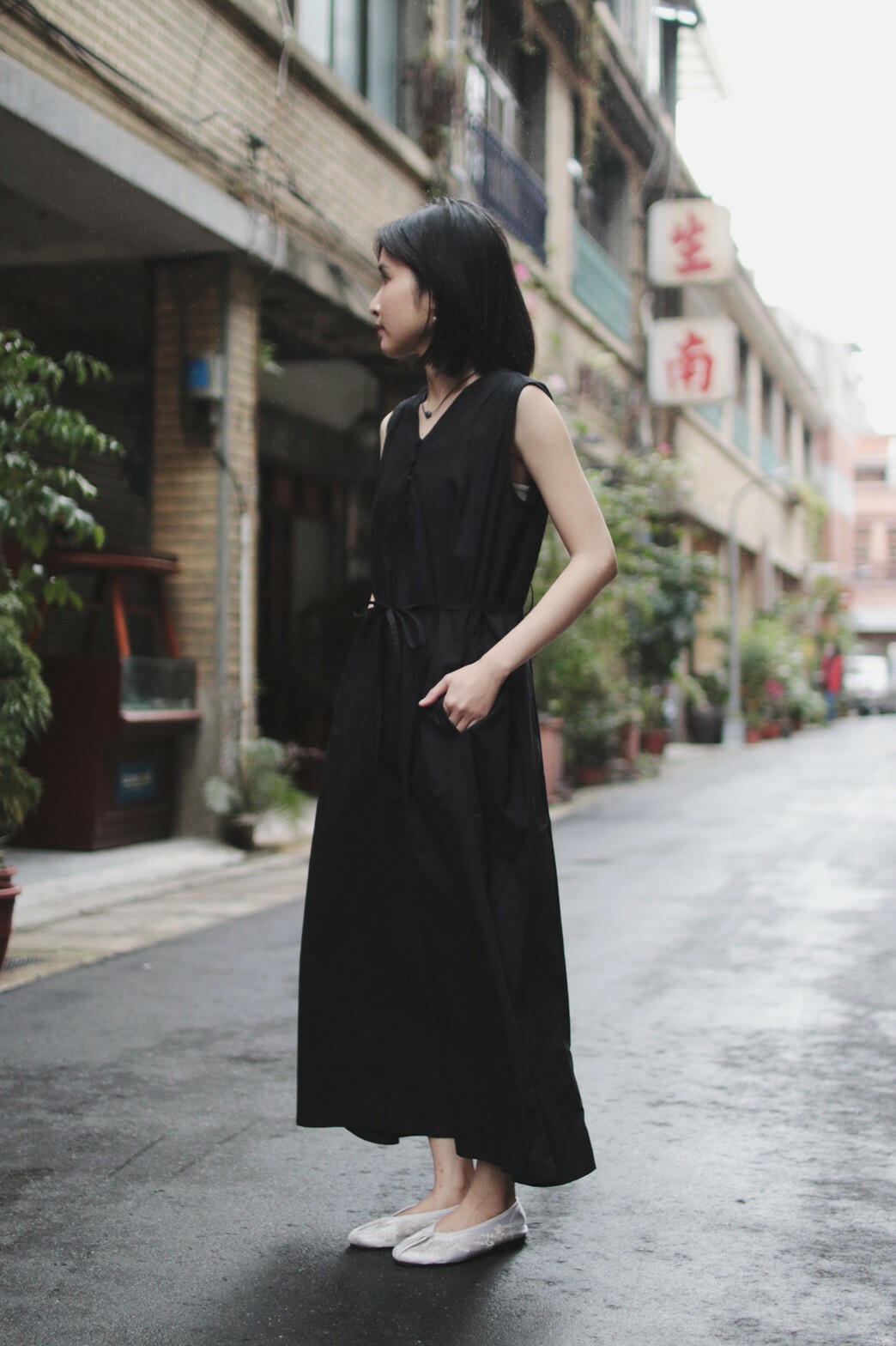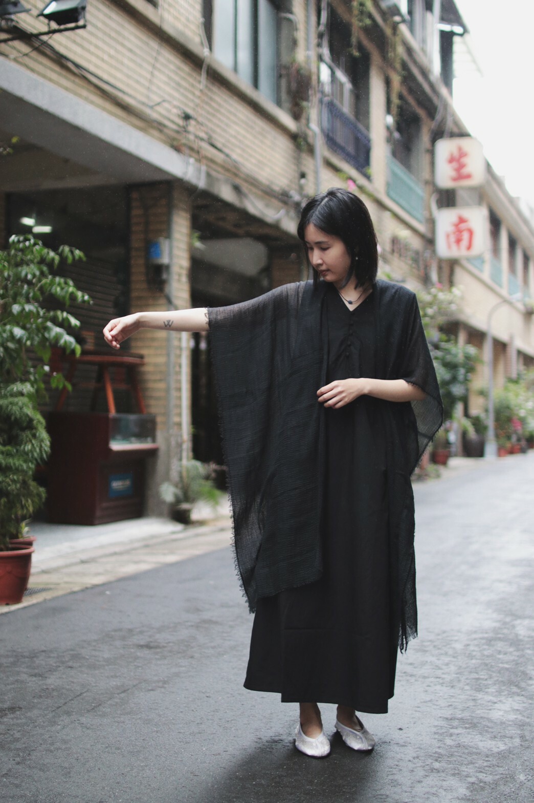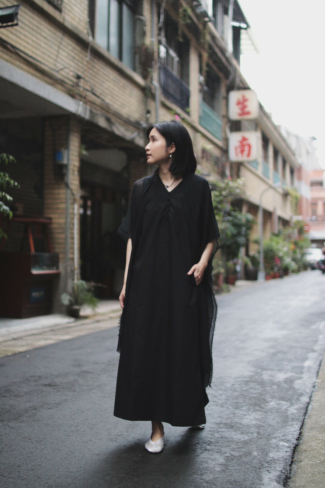 襯衫材質的收腰洋裝搭配輕薄透視感的棉紗質感披肩,讓層次感更為豐富外,也能適應不同的天氣變化。