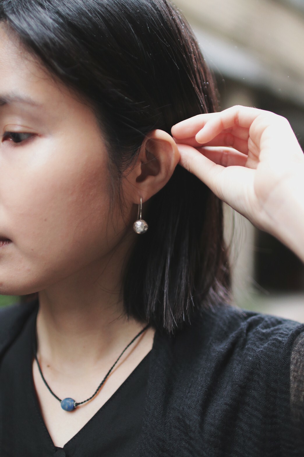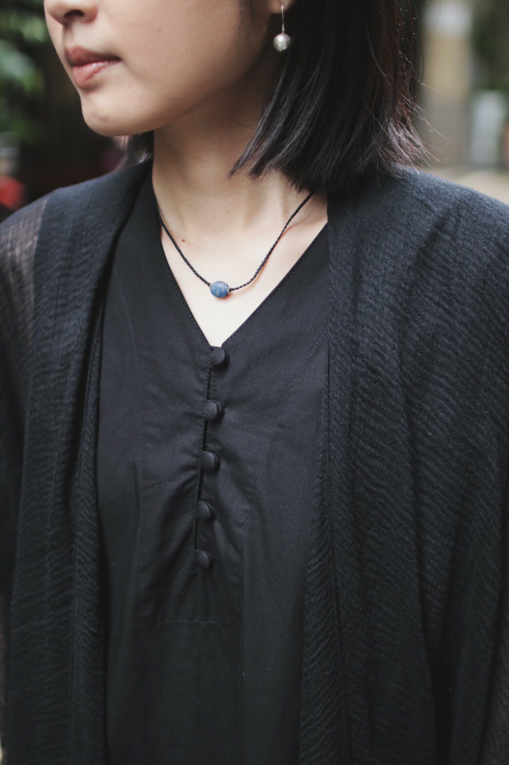 飾品選擇簡約的球型耳環與編織短練,在整體的黑色中顯得更加個性有精神。