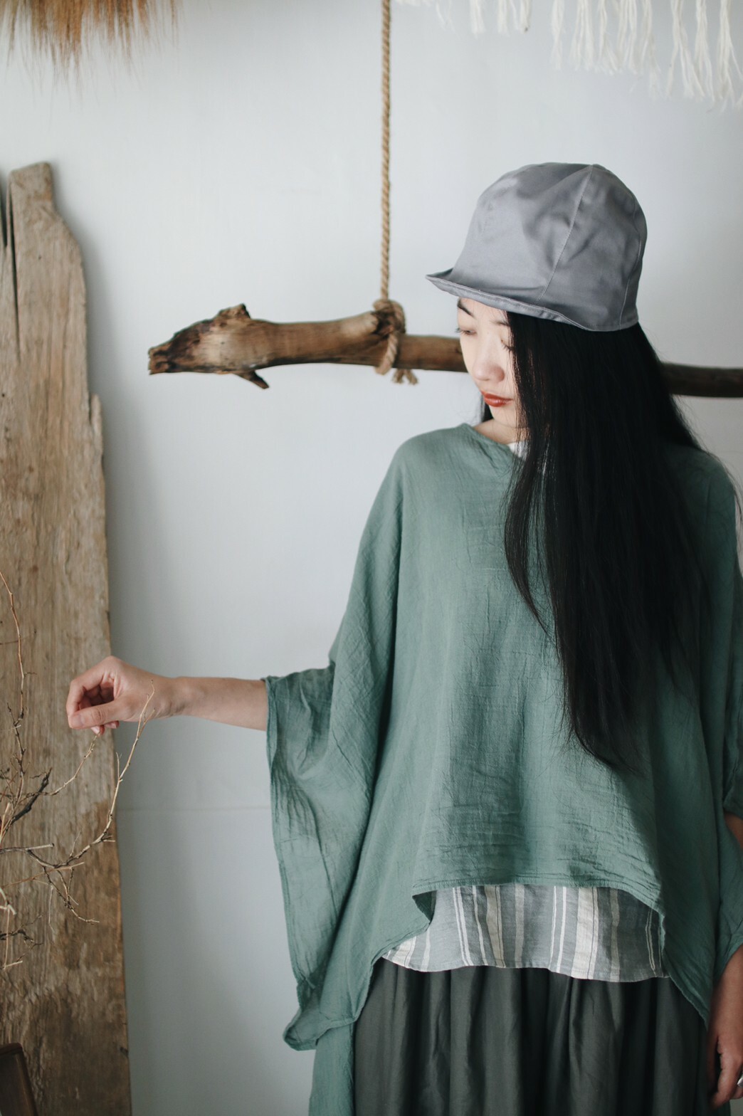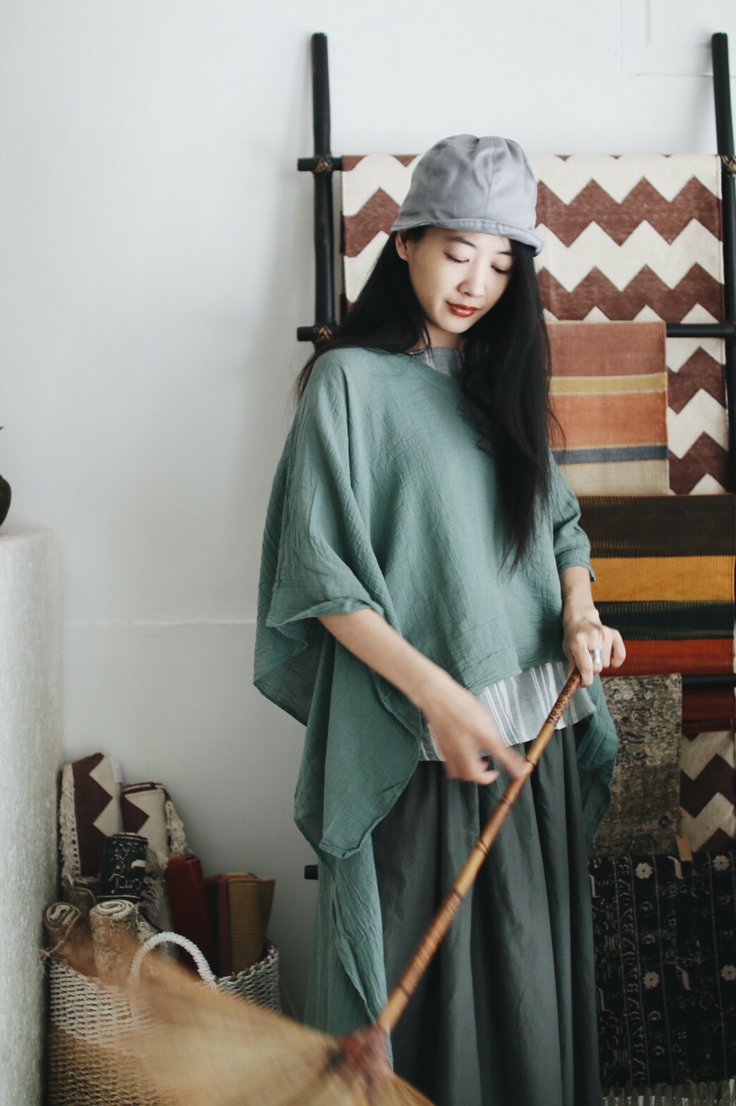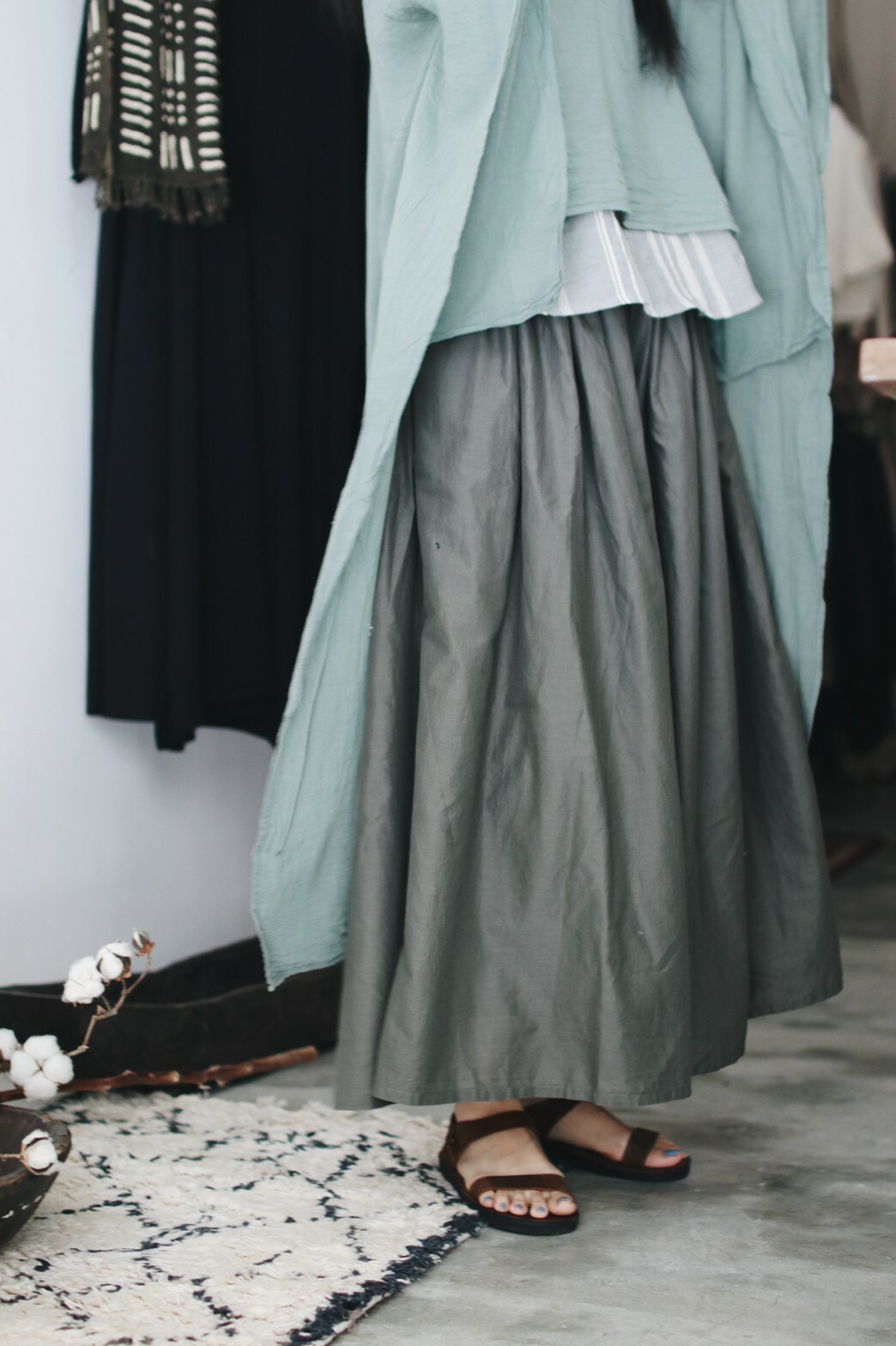 在深淺綠色之間,用灰色的直線條銜接調和,飄逸的上窄下寬垂墜輪廓,讓行走間充滿微風的舞動。