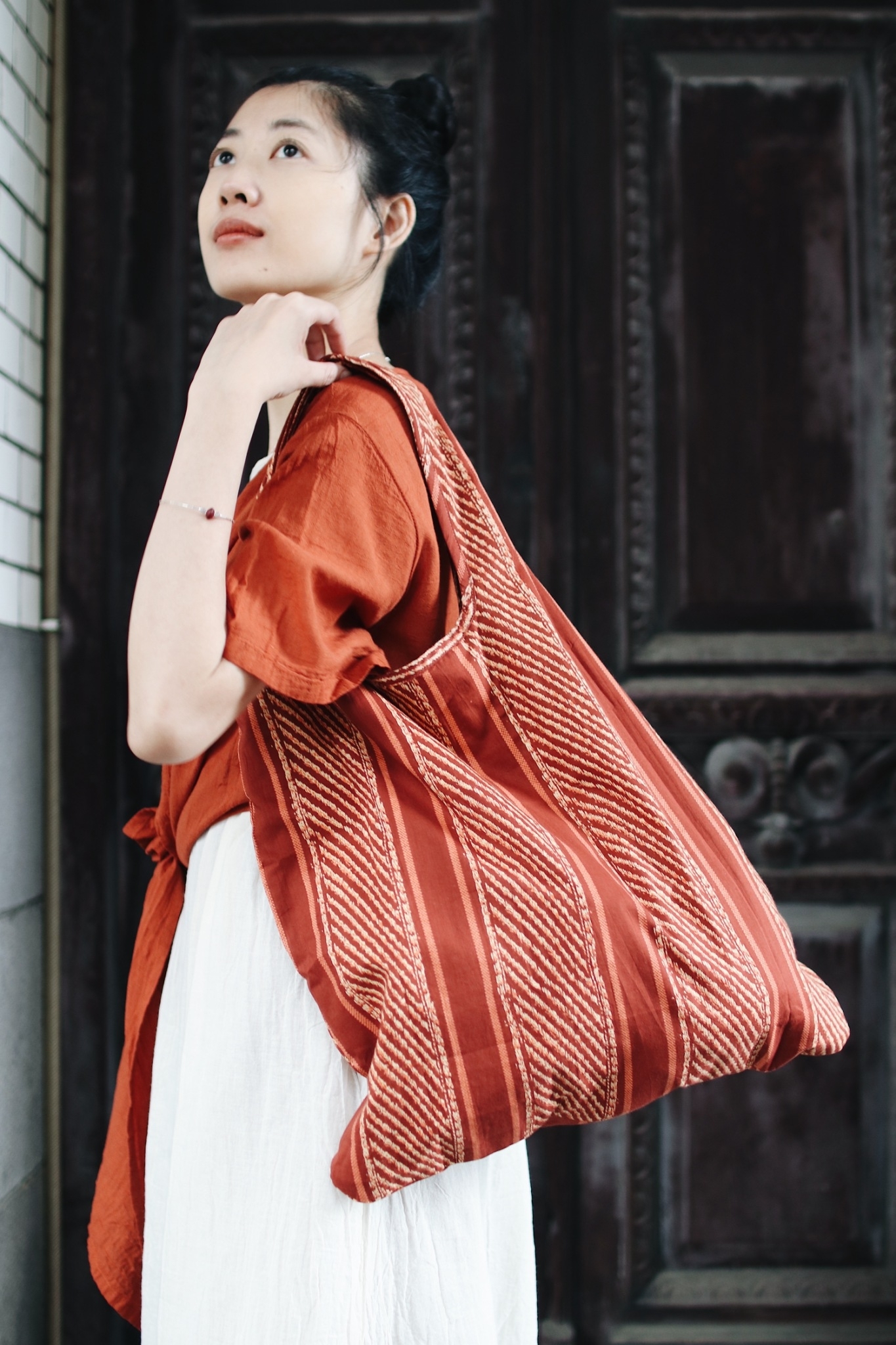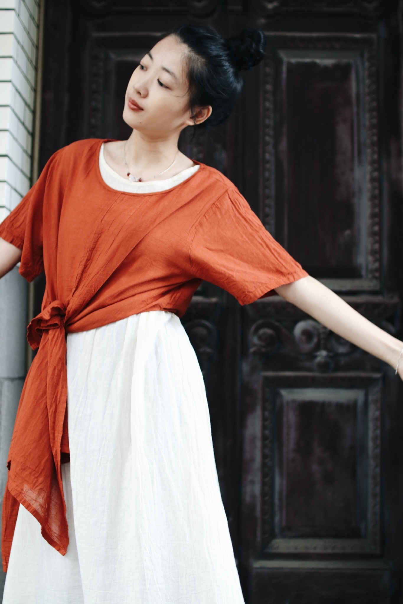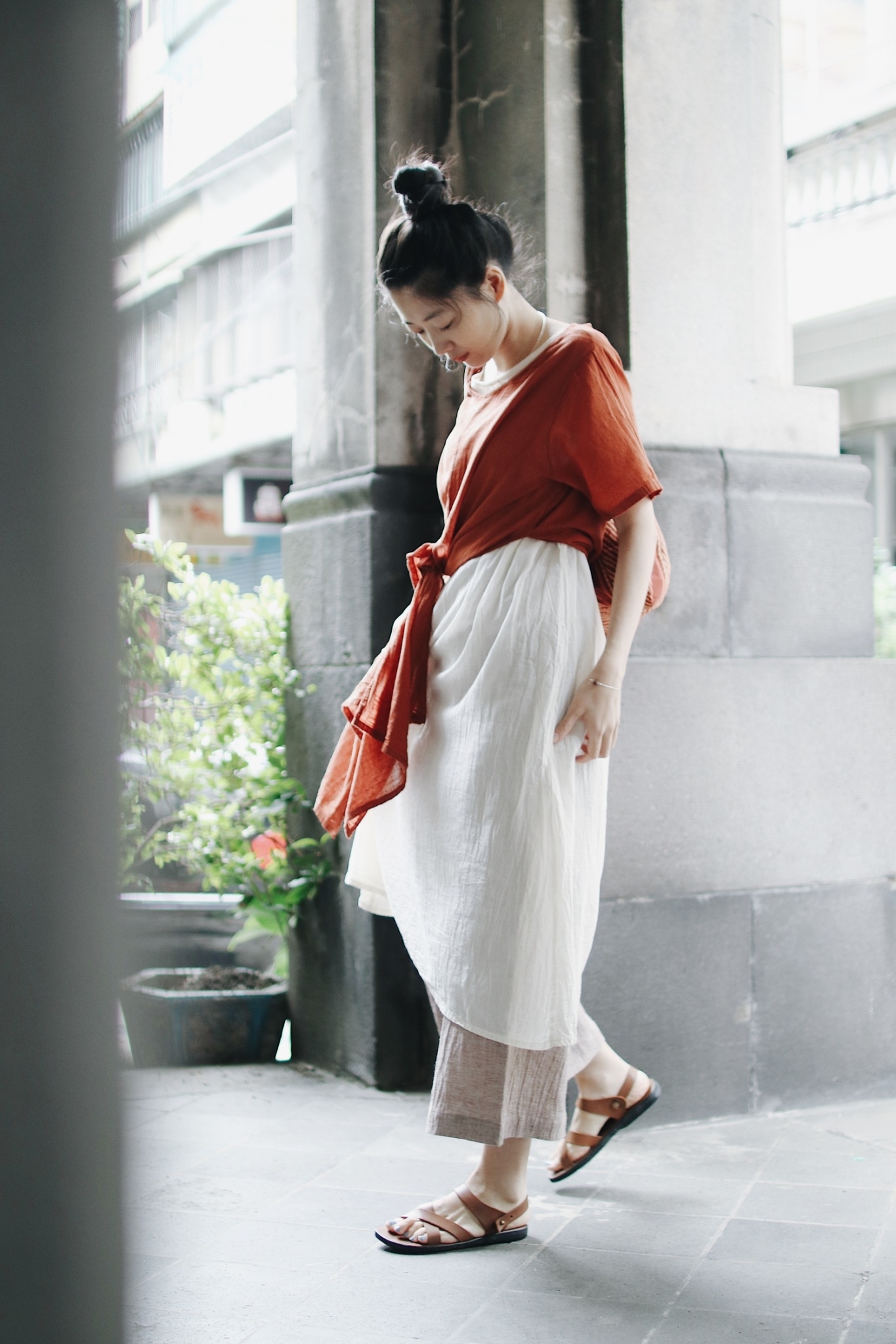 以橘白麻三色為基調的暖色系輕鬆穿搭,將開衩的衣襬綁在腰際是我們基本款雙層四片開衩上衣的隱藏版穿法。