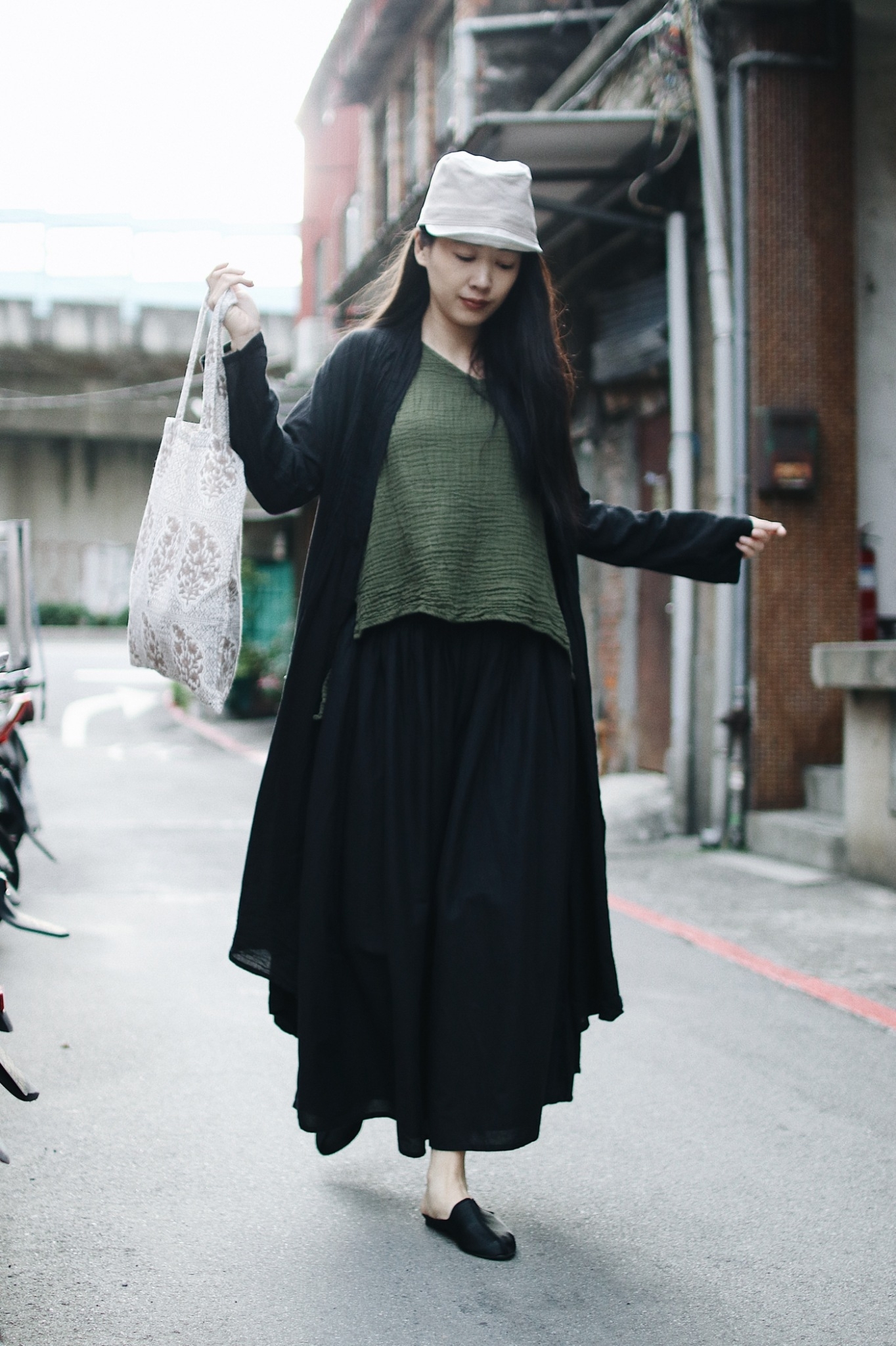 以深色為主的穿搭,仍可運用不同的材質營造層次感,用輕薄的巴里紗與純棉互相堆疊,在悶熱的夏季中也能感到輕盈舒適。