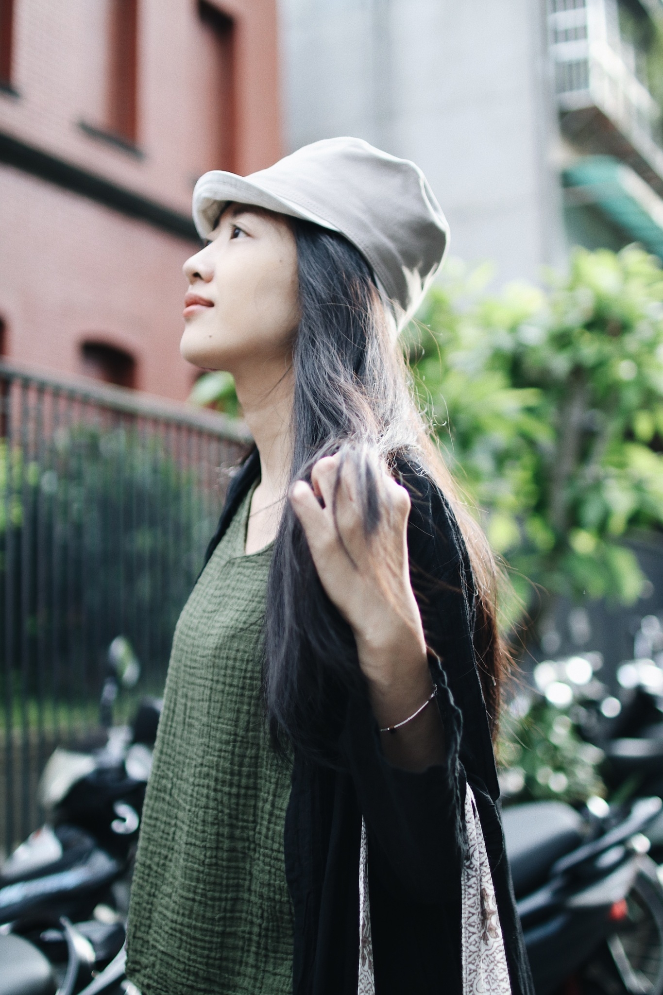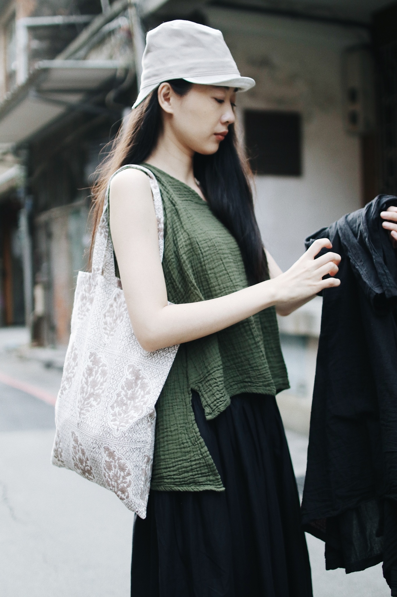 在大面積的黑色基調中內搭軍綠色的背心上衣,並以淺米白的帽子與提袋作為點綴。