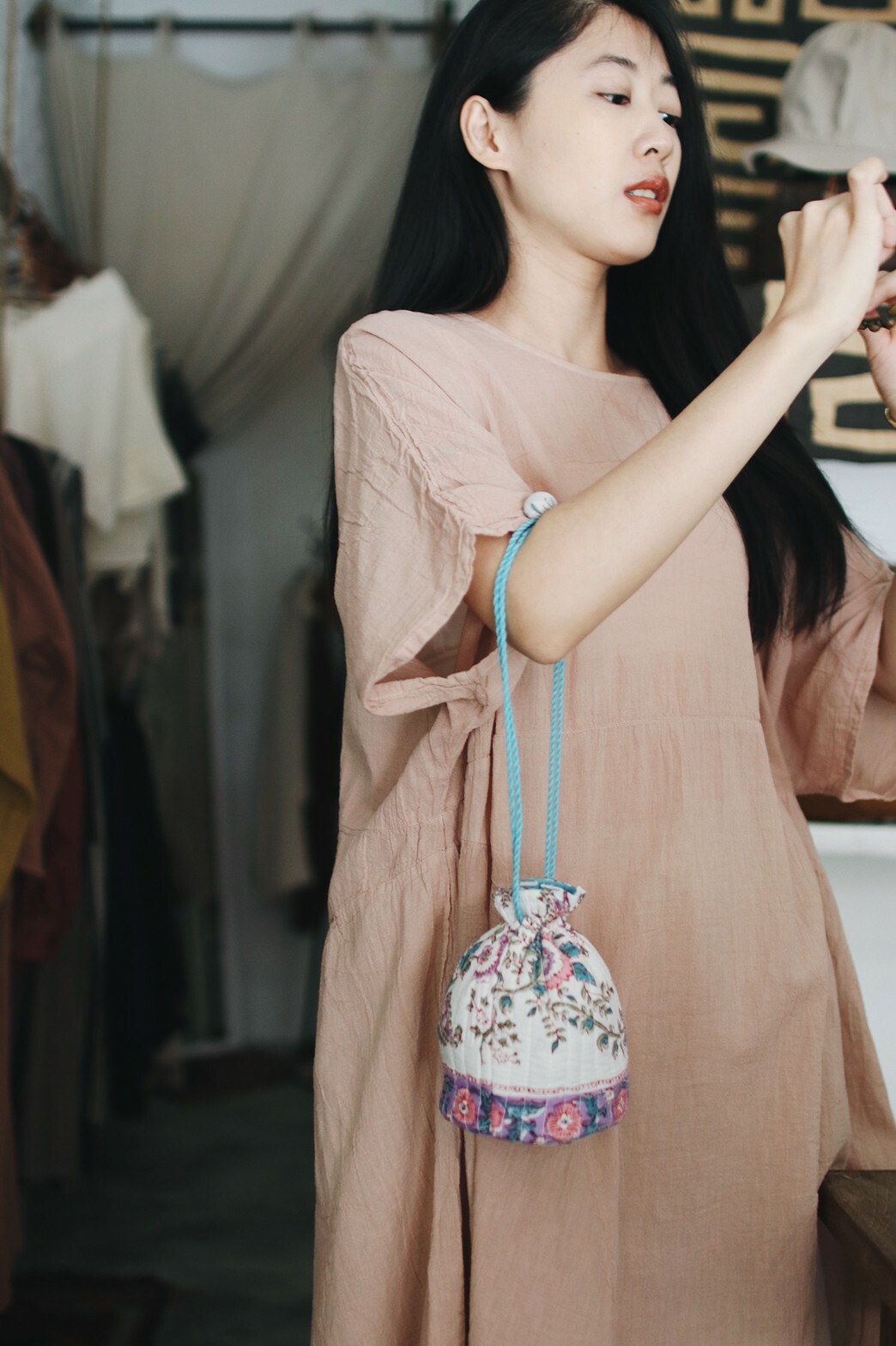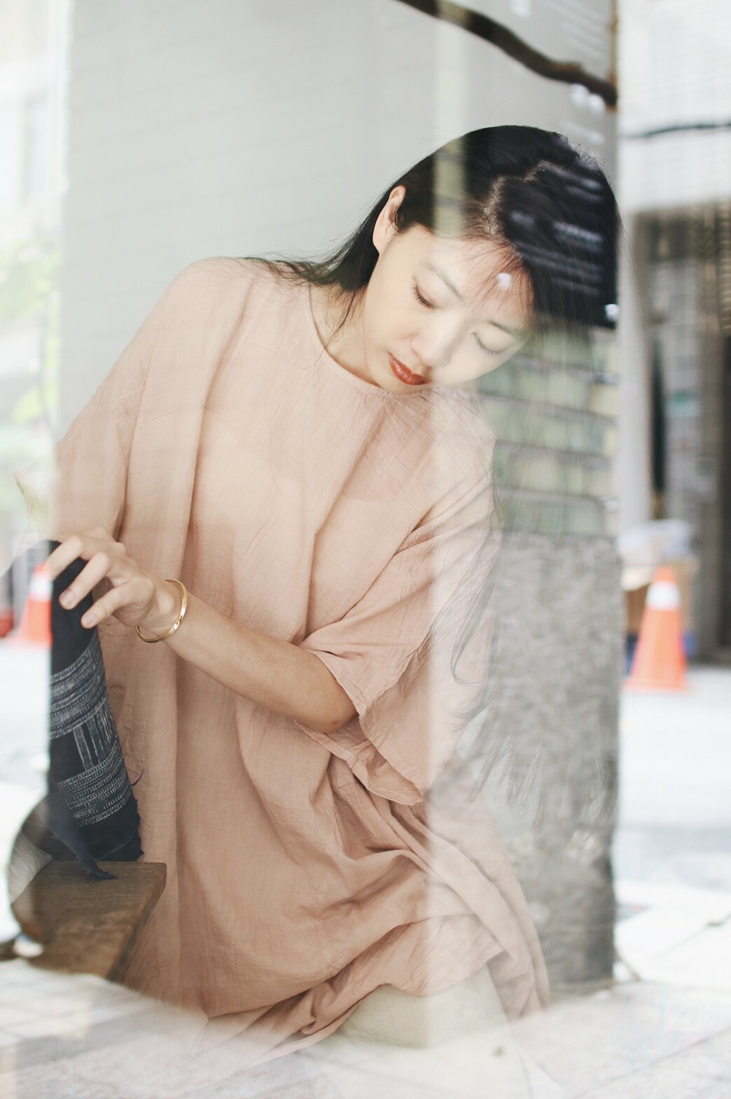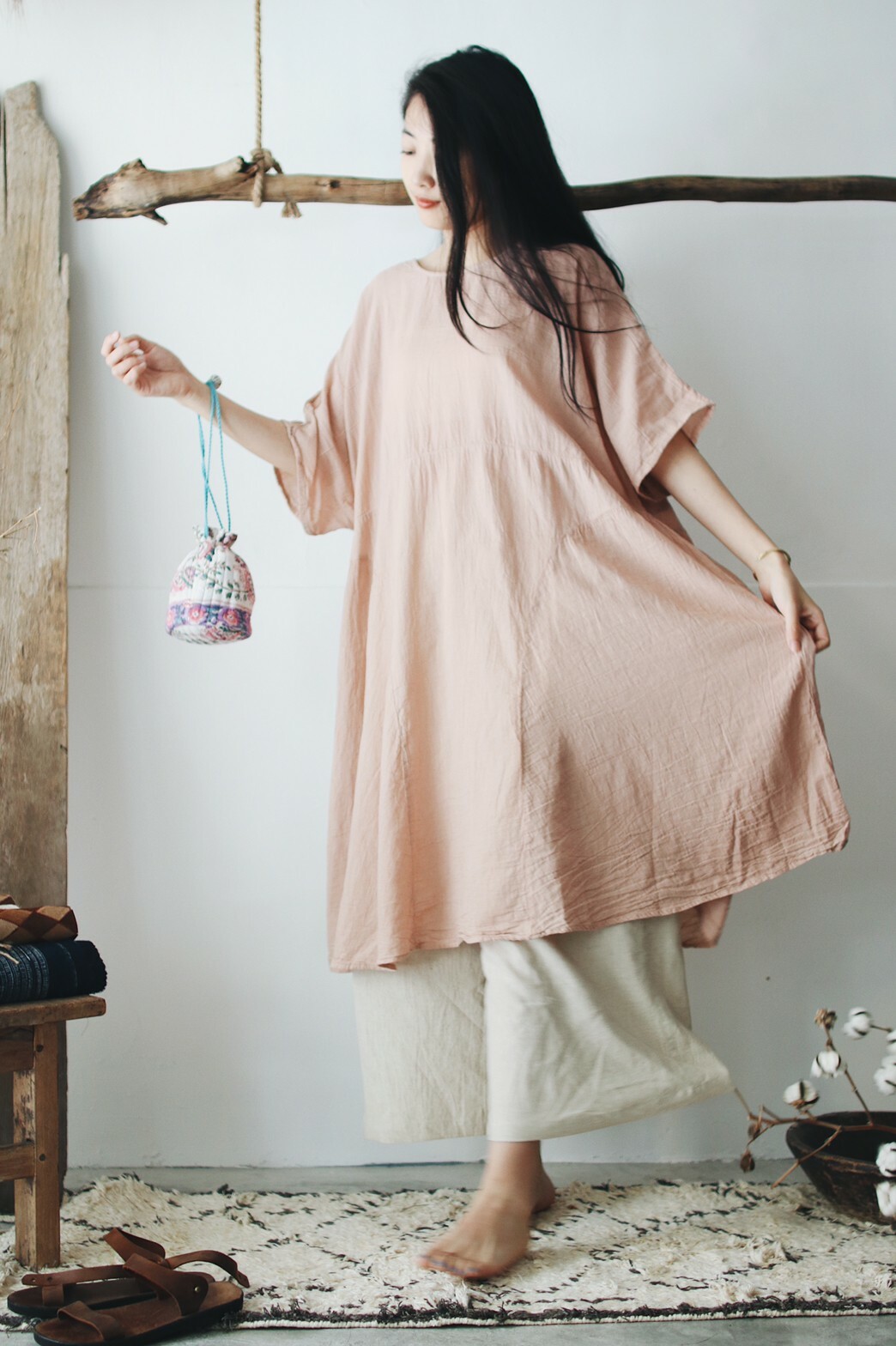 以橘粉色的洋裝搭配麻色的褲子,舒適之餘又帶有柔美的休閒風格,無論是日間的居家辦公或是傍晚的休閒散步都很適合。