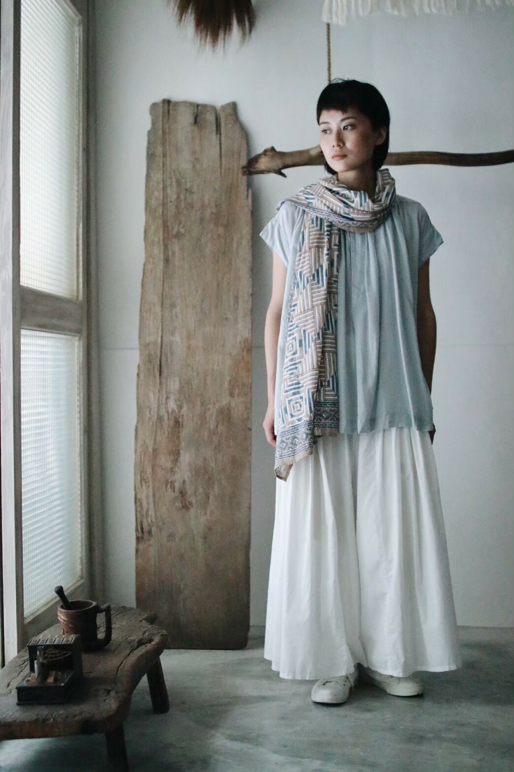 微透的淺藍色搭配純白的寬版褲裙,彷彿清晨薄霧的柔和色調,隨意圍上淡彩色系的圖騰薄圍巾,可以因應早晚的溫差變化也是整體搭配的重點,用清爽的配色銜接夏末初秋,輕鬆寫意的輕盈好感穿搭。