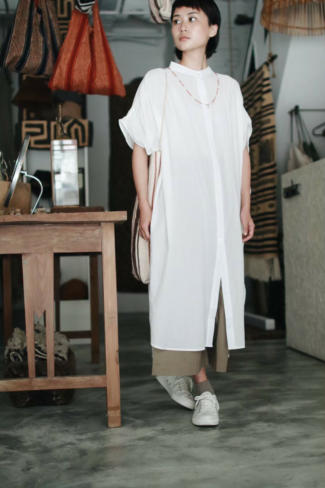 俐落剪裁的白色襯衫洋裝,適合與特色飾品搭配,長版的下擺開衩設計,可隨意內搭舒適的褲裝或是長版的裙裝,清透的空氣感作為秋季的多層次搭配,簡單輕鬆展現符合自己的個人風格。