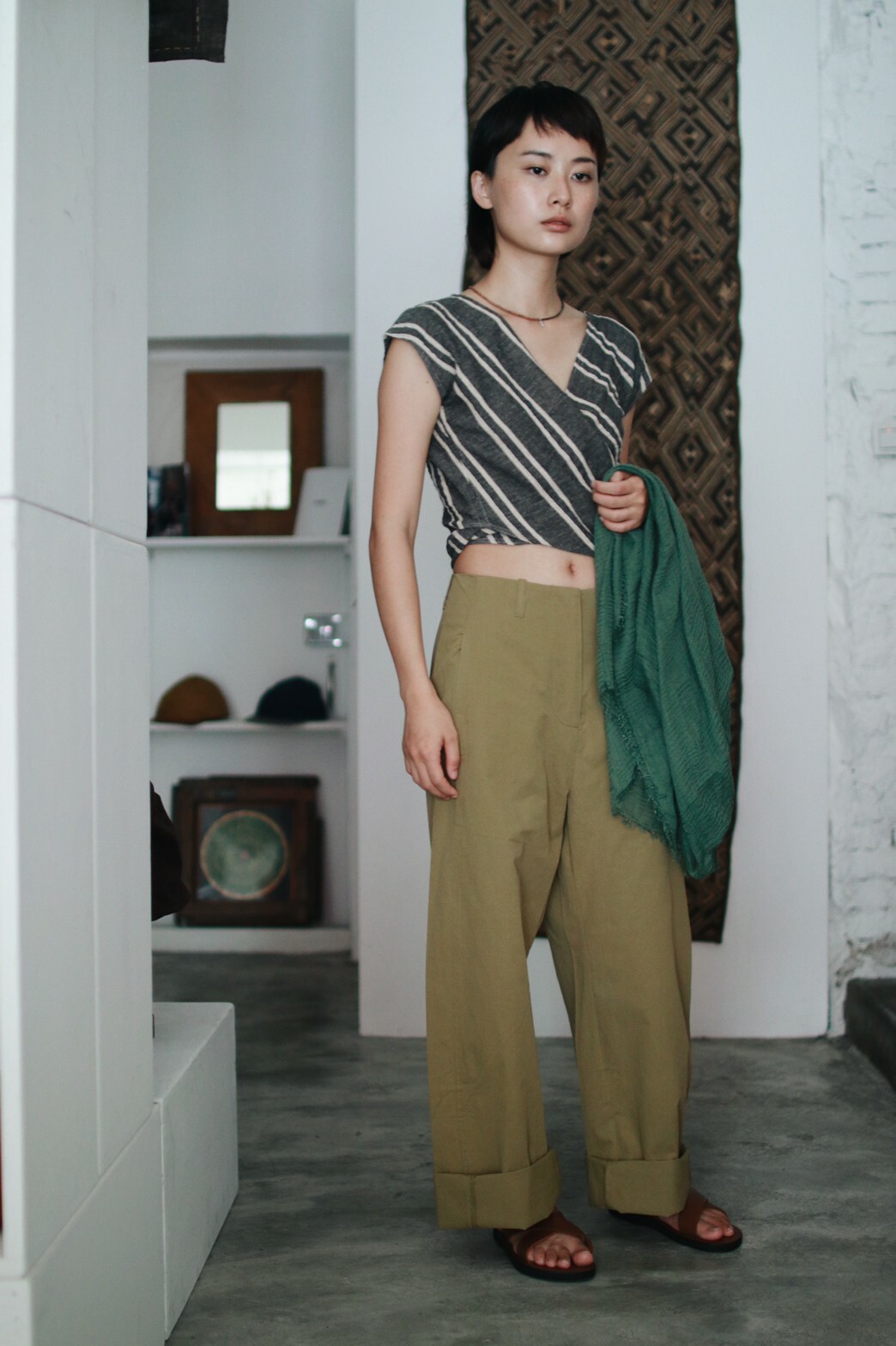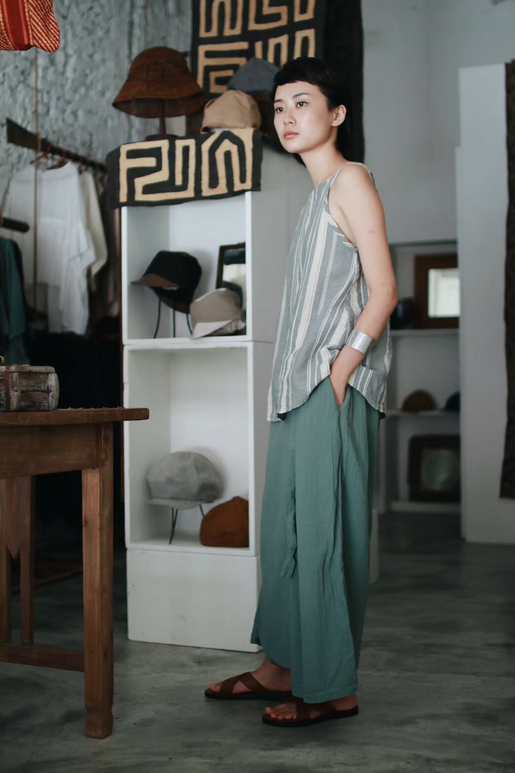 初秋的綠色不同於炎夏的明亮炙熱,用水洗的淡彩調出秋天專屬的綠色氛圍,削肩的條紋細肩帶有著慵懶的度假氣氛,搭配隨性舒適的造型前覆片側綁帶長褲,讓行走間的每一個步伐都是率性自得。