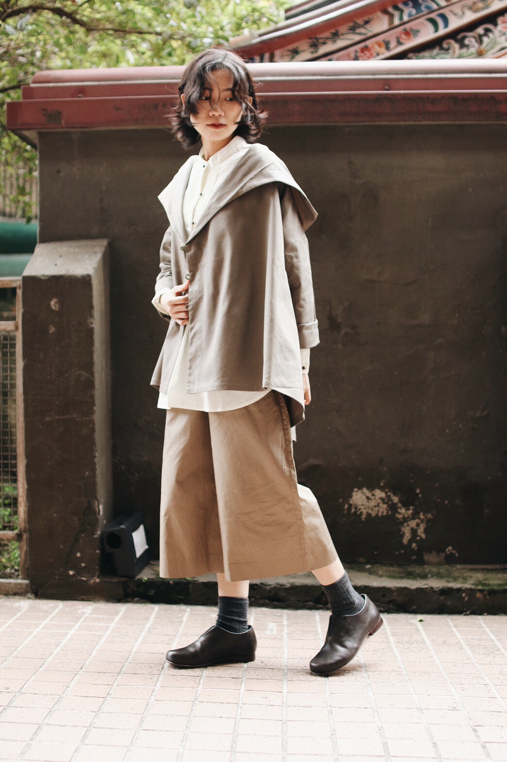 有大大帽子的短版外套,寬鬆的斗篷剪裁內搭無領襯衫,讓視覺清爽又可愛,與9分寬褲搭配,營造出輕盈知性的活潑感覺!