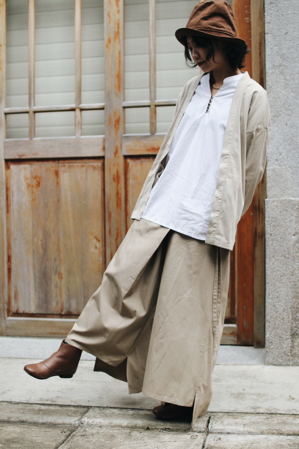 無釦的開襟設計輕鬆自在,用淺色系的搭配統一上下半身,再用較深色的帽子來平衡,呈現俐落又灑脫的氛圍。