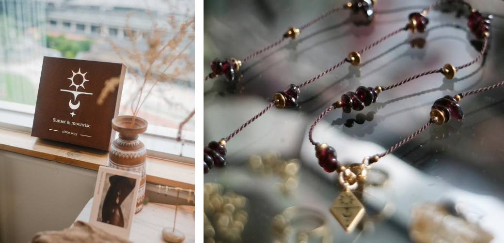 Sunset & moonrise 的作品最大特點就是具有品牌辨識度的礦石,透過設計師的美感與靈活的雙手,編織出一件件飾品,這不僅是穿搭上的點綴,也是將簡單、純粹、優雅成為日常的一部分。