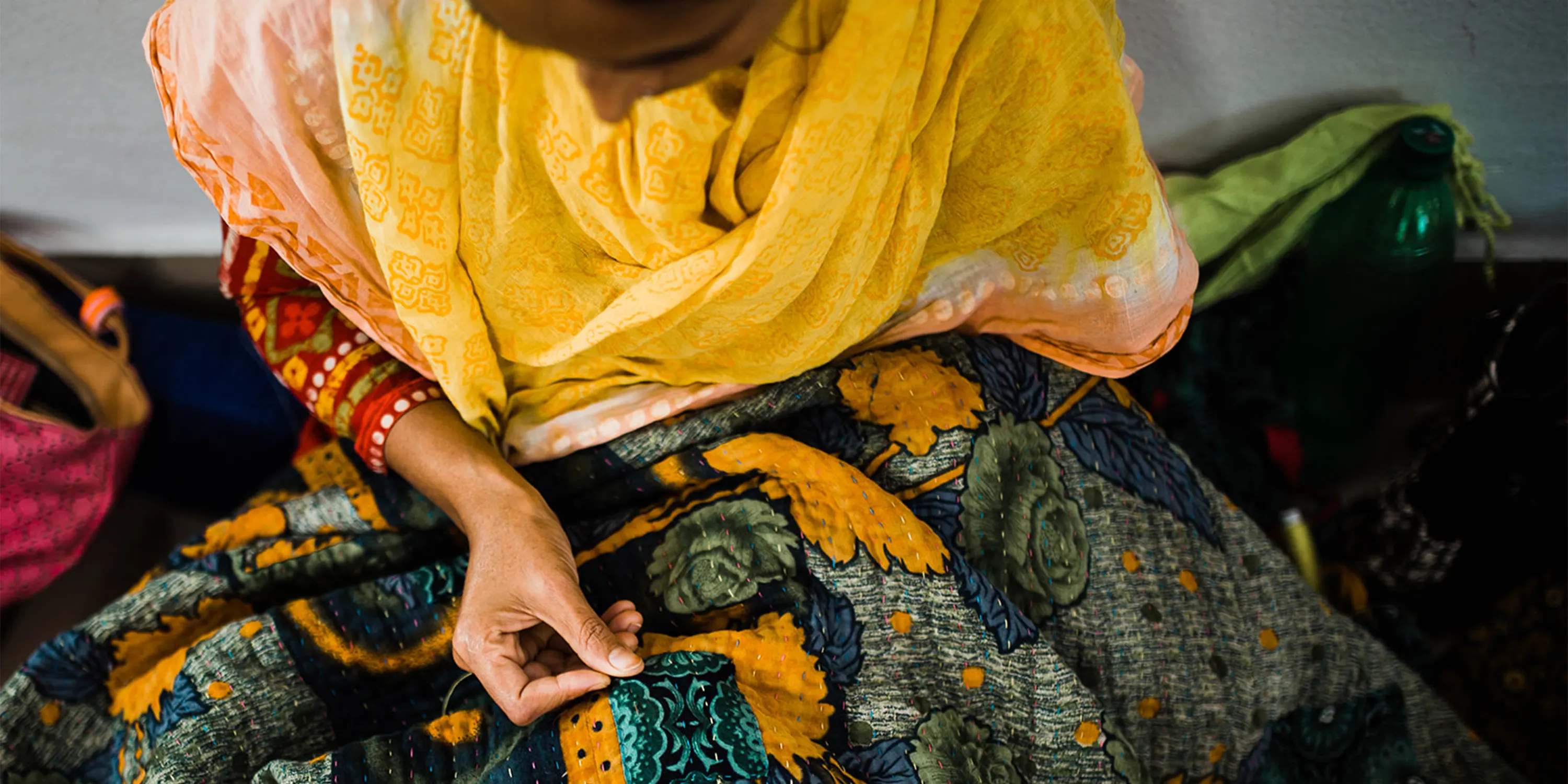 ▲ 正在將一塊老式紗麗縫成被子的婦女 Basha 2021