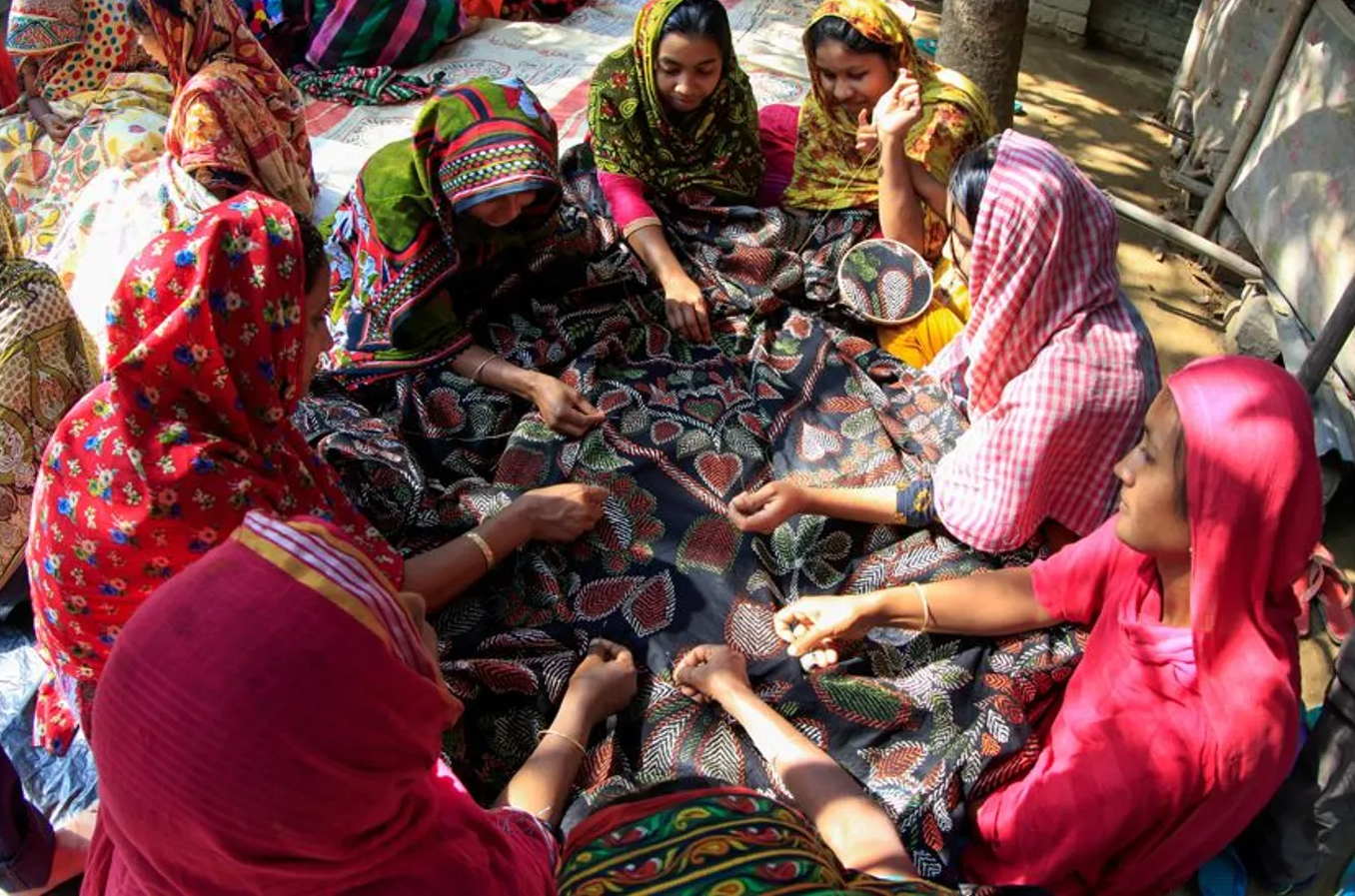 ▲ 一起製作一塊坎塔的孟加拉農村的女工匠們 (圖片來源:Alamy)