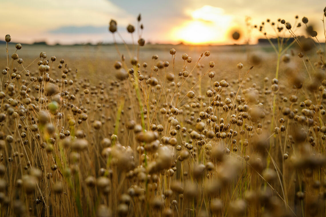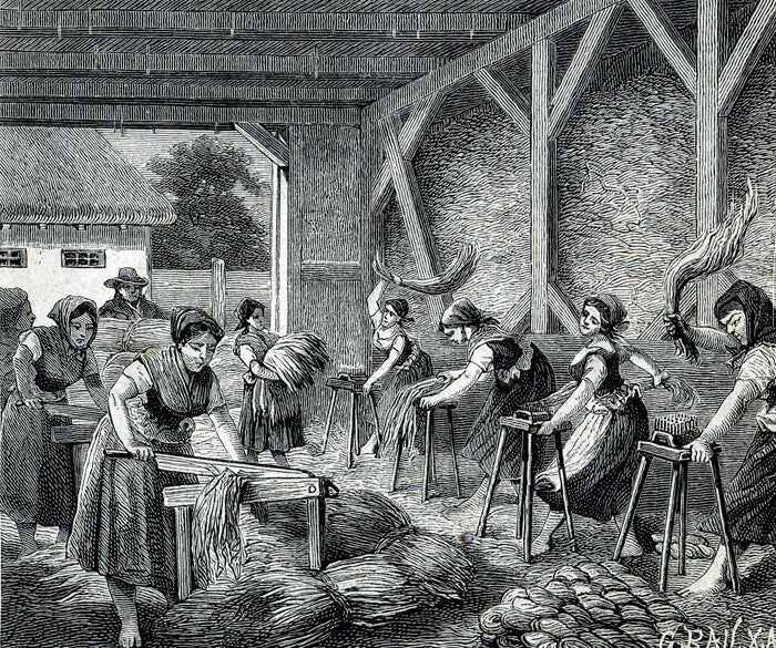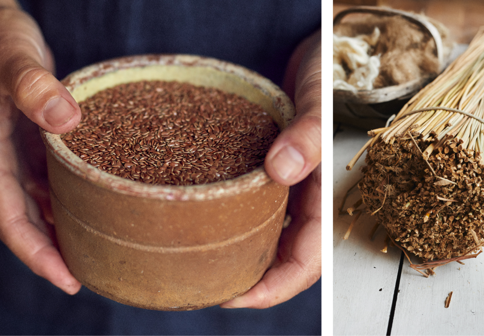 手工採收的亞麻莖在露天乾燥數週後會脫粒去除種子,這些種子可以用於下一季的播種,或作為穀物添加到麵包中成為健康的食物,纖維製作過程中剝離的短纖維也可以再製成不同的織物。