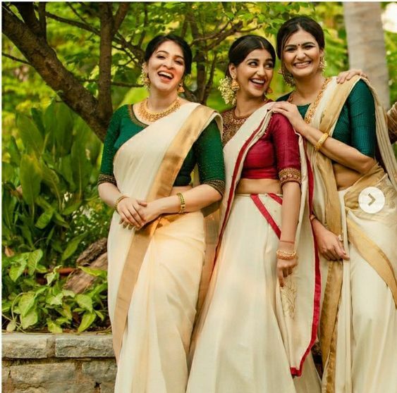 ▲ 著 Kerala set mundu 的新娘與伴娘(圖片來源:pinterest)