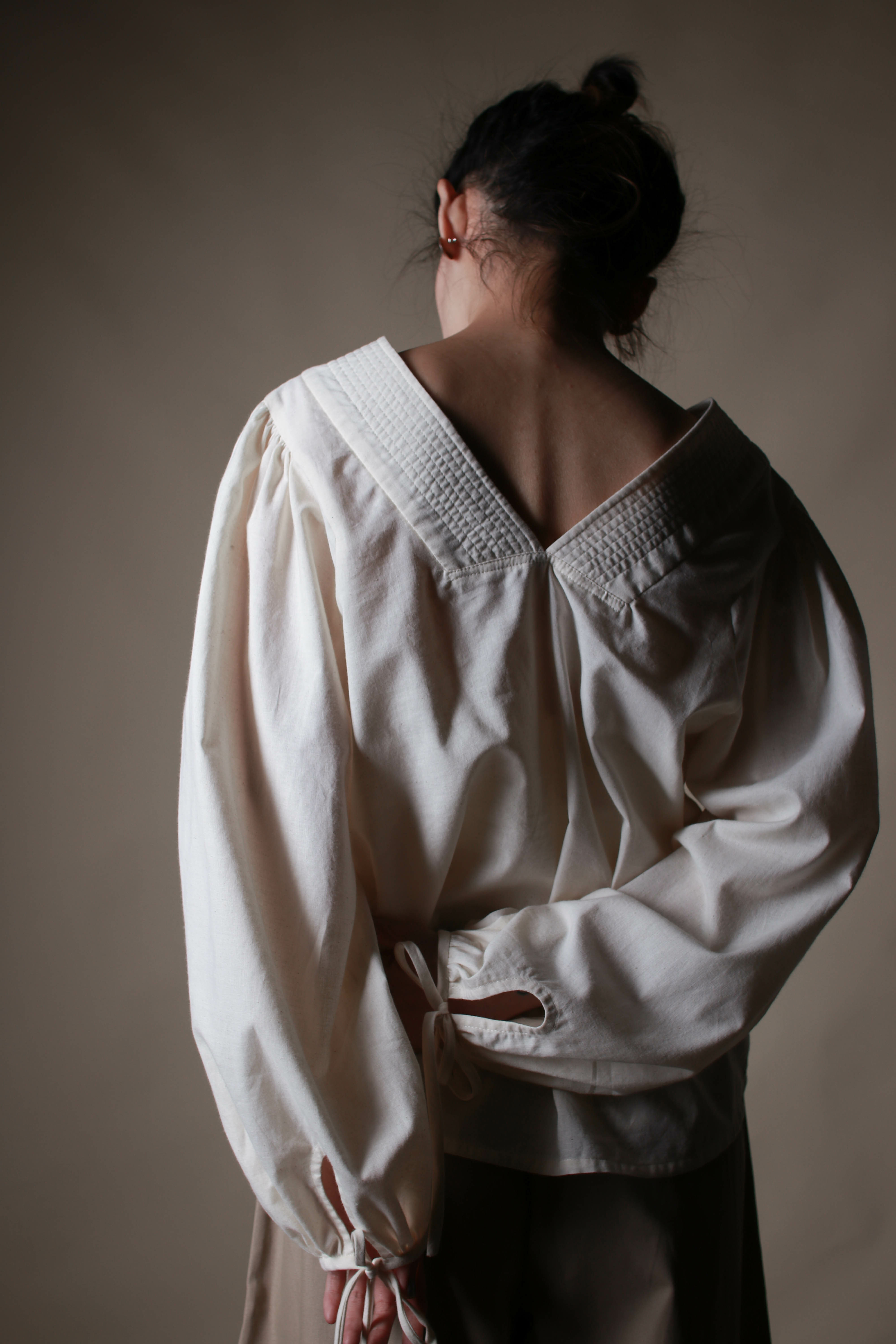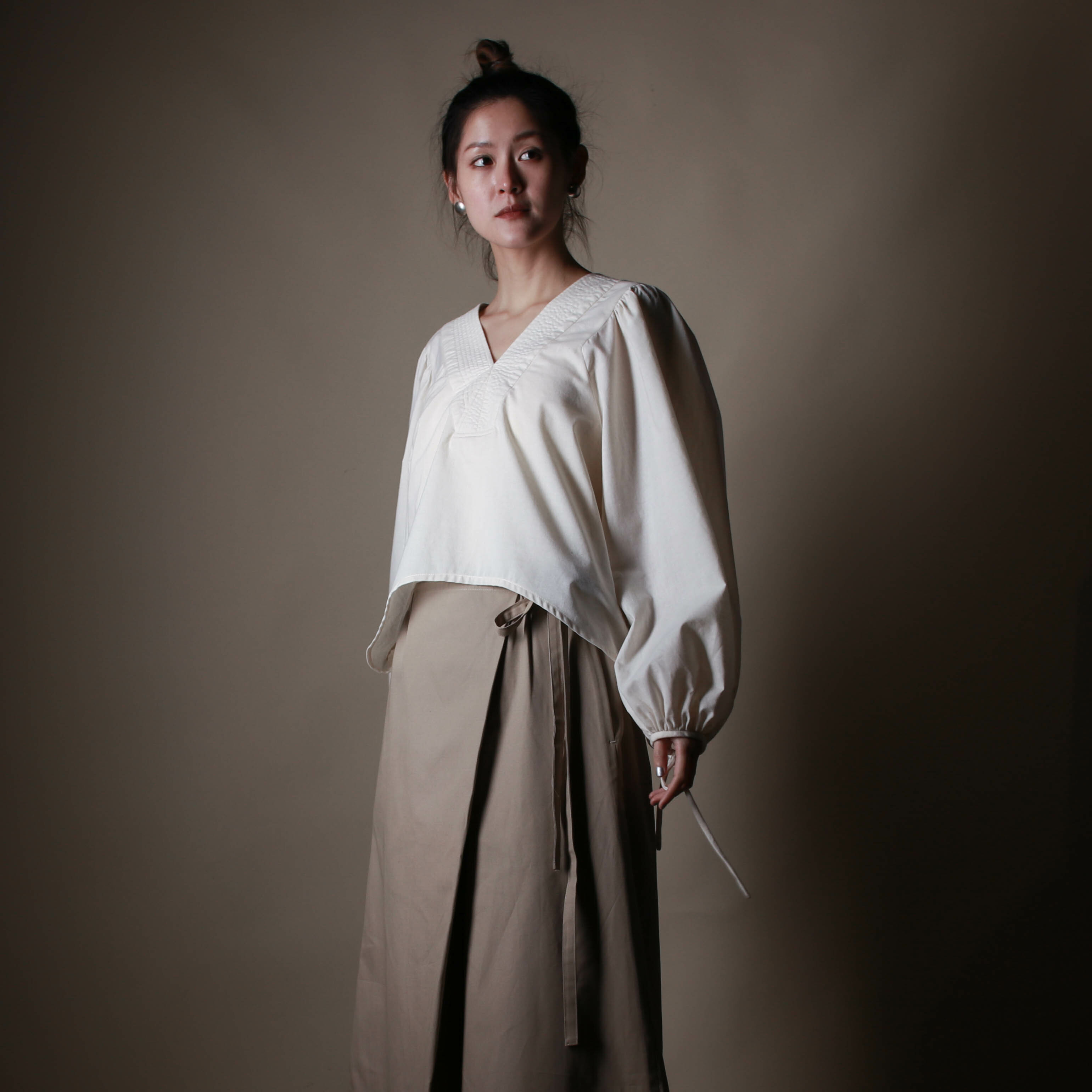領口縫線的裝飾,在V領的開口爬升。 袖口以綁帶設計,點綴腕間。