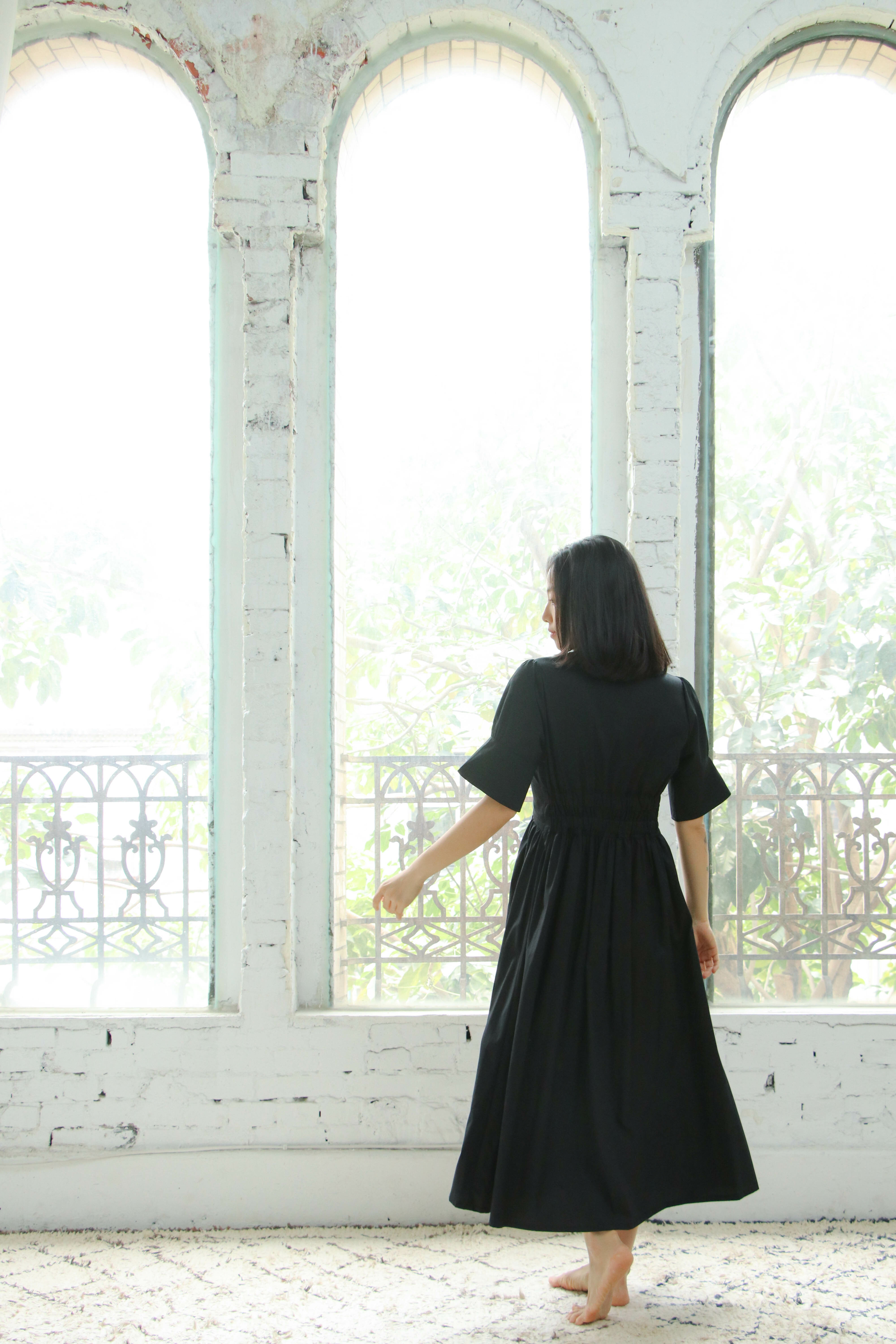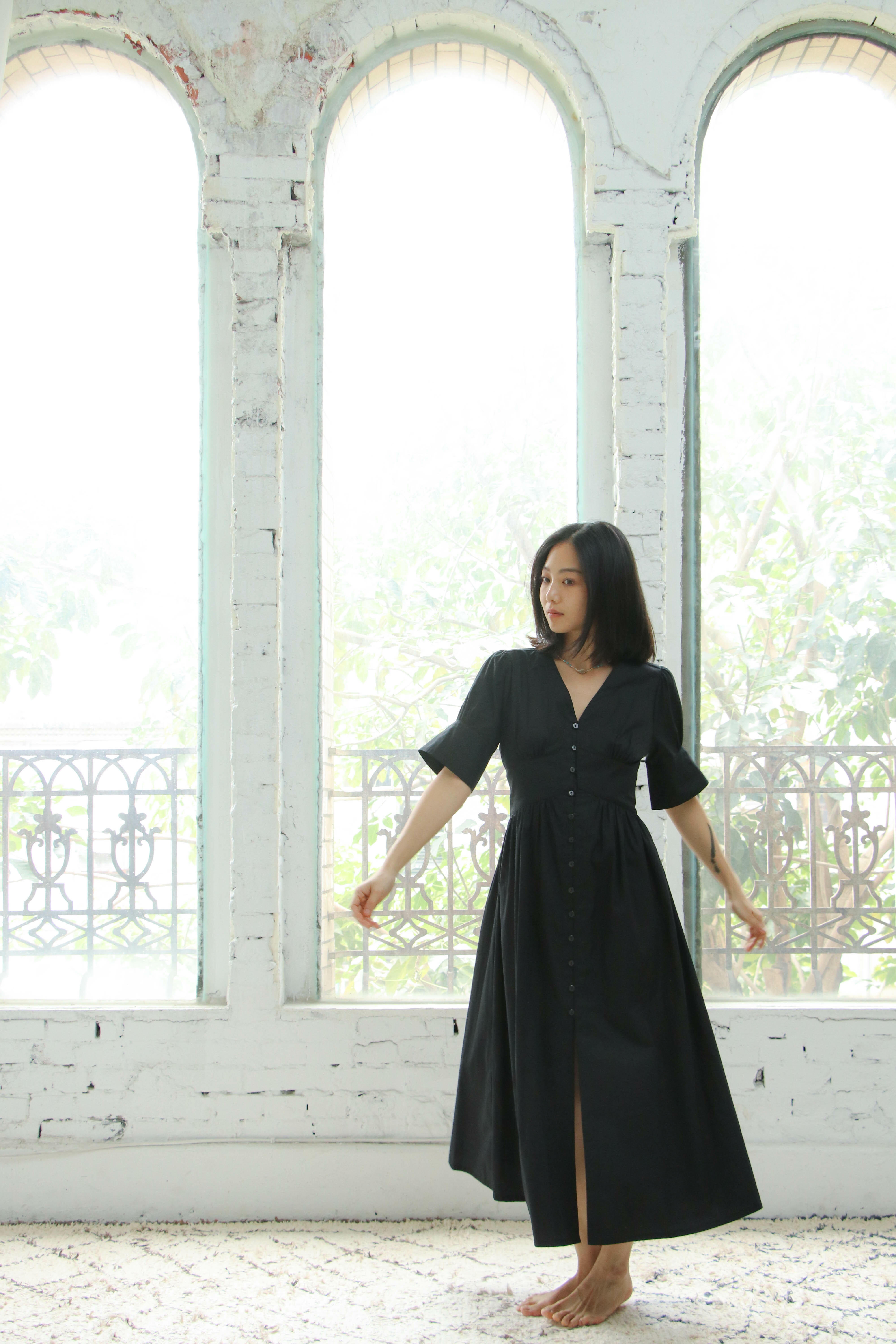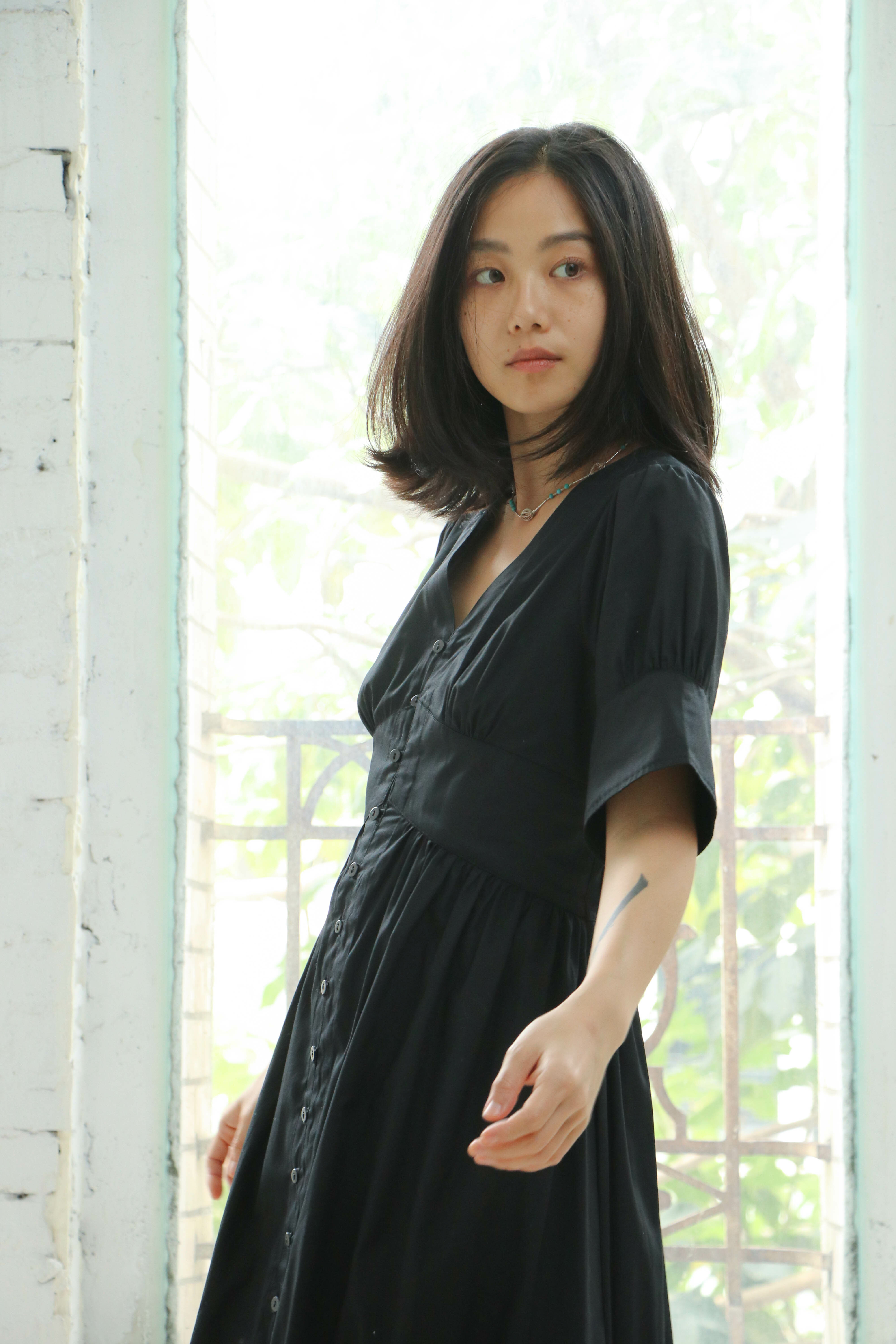 靈感來自異國 cottage 的洋裝輪廓,雖採收腰設計,利用釦子和背後的彈性,讓著衣者的活動度依舊不受限制。袖子的設計希望可以讓這件洋裝,保有自由不受拘束的浪漫。