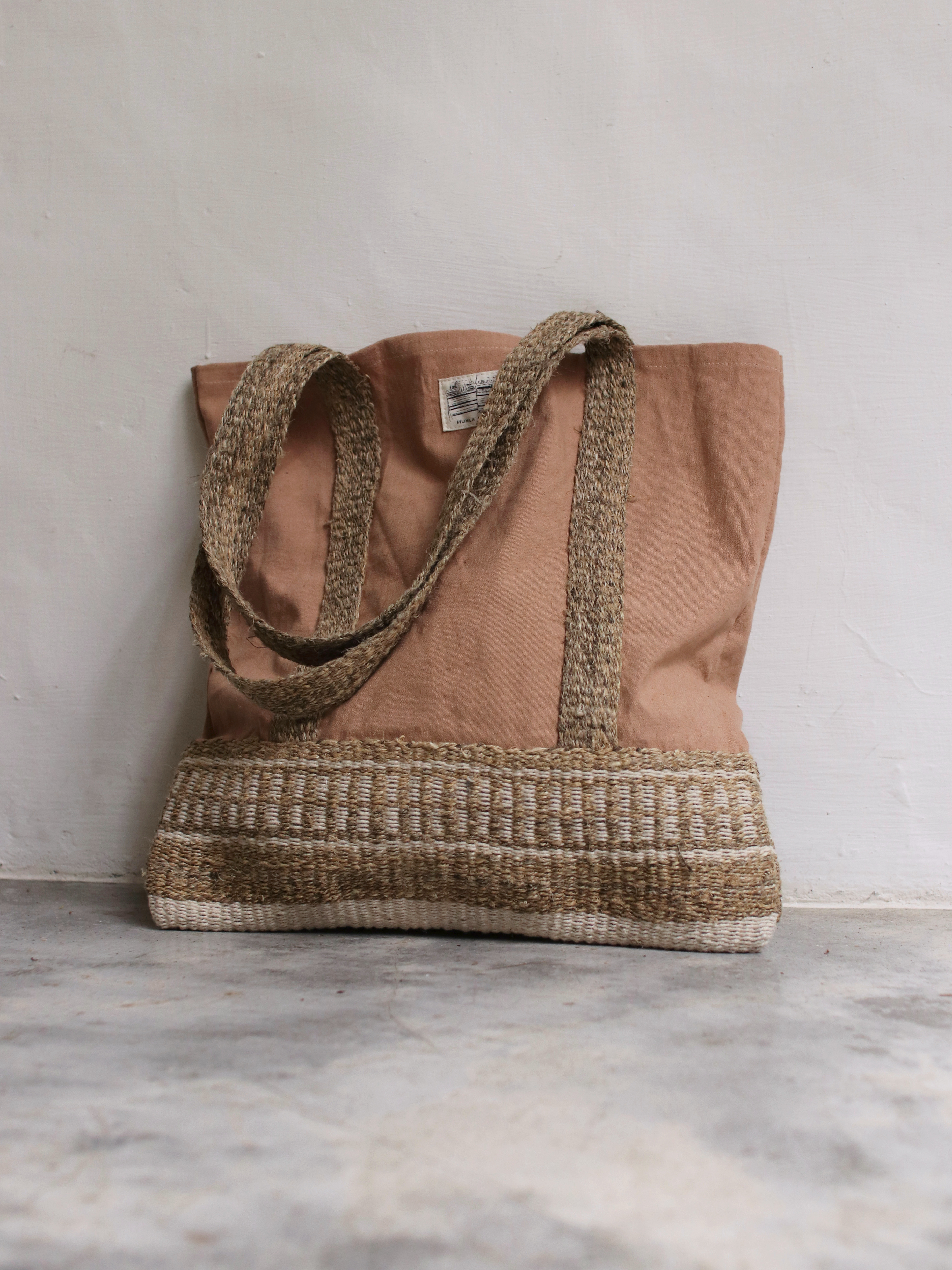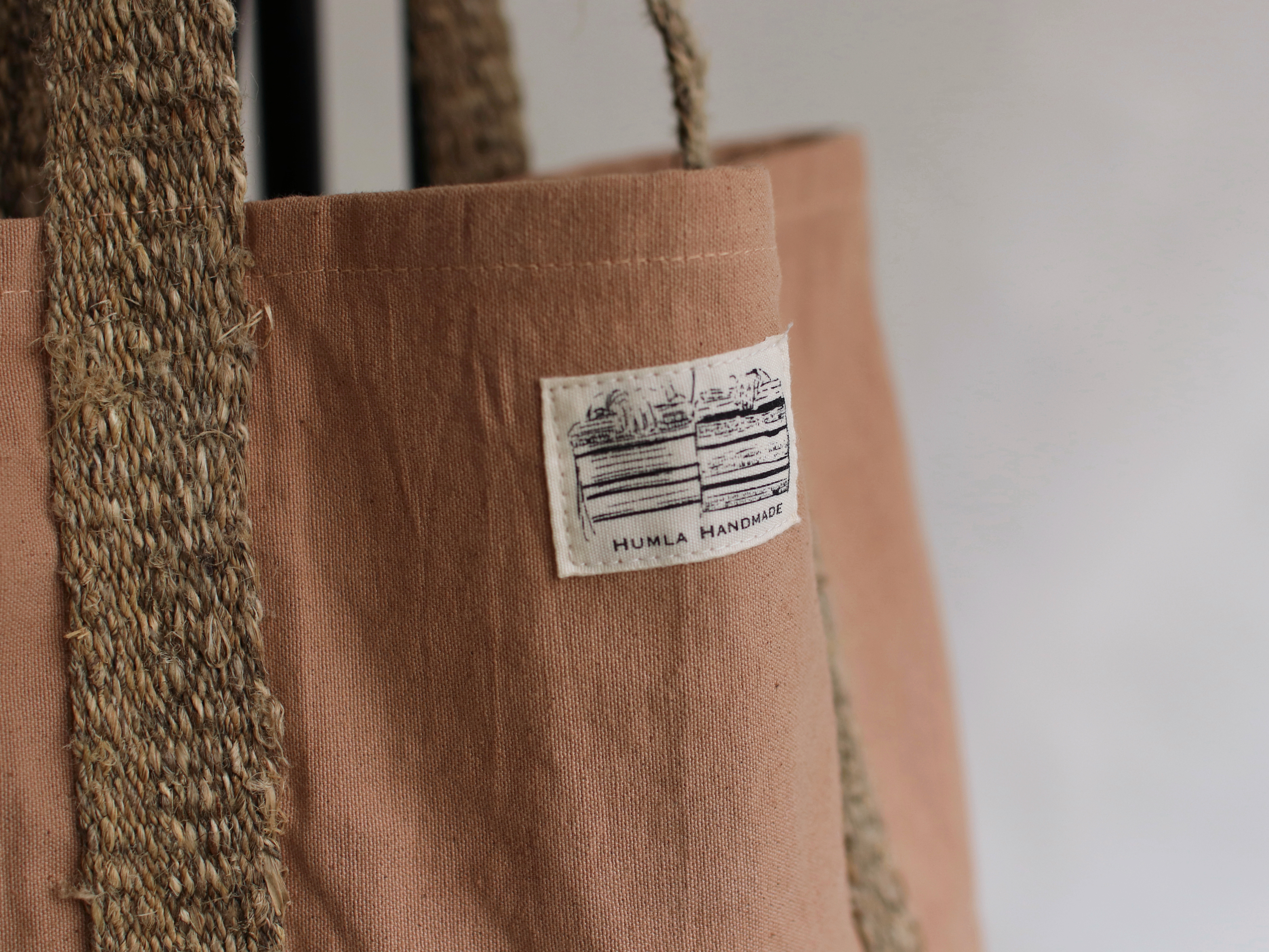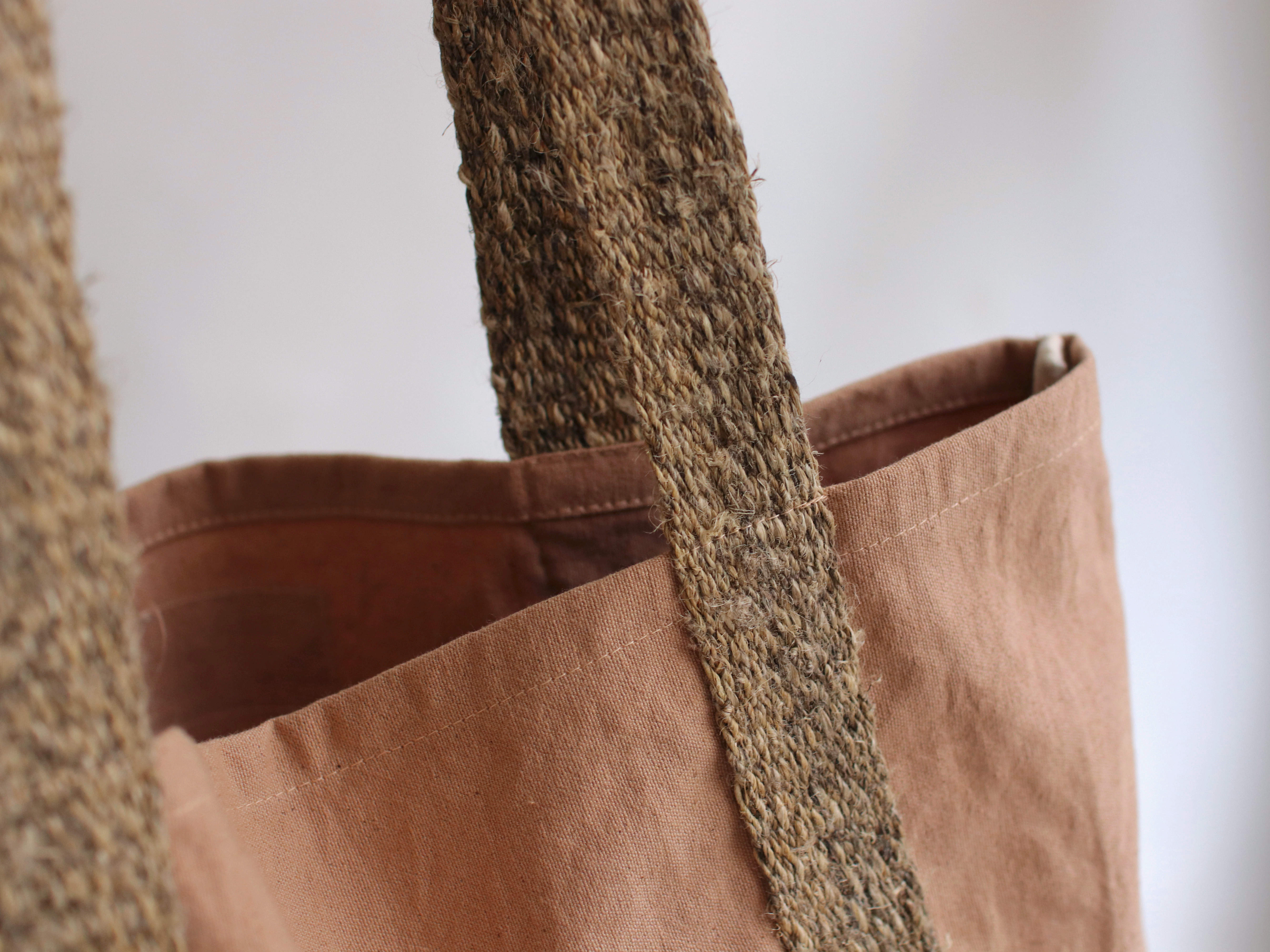 從纖維的捻製成線,經過地織機的織做的大麻纖維托特包。