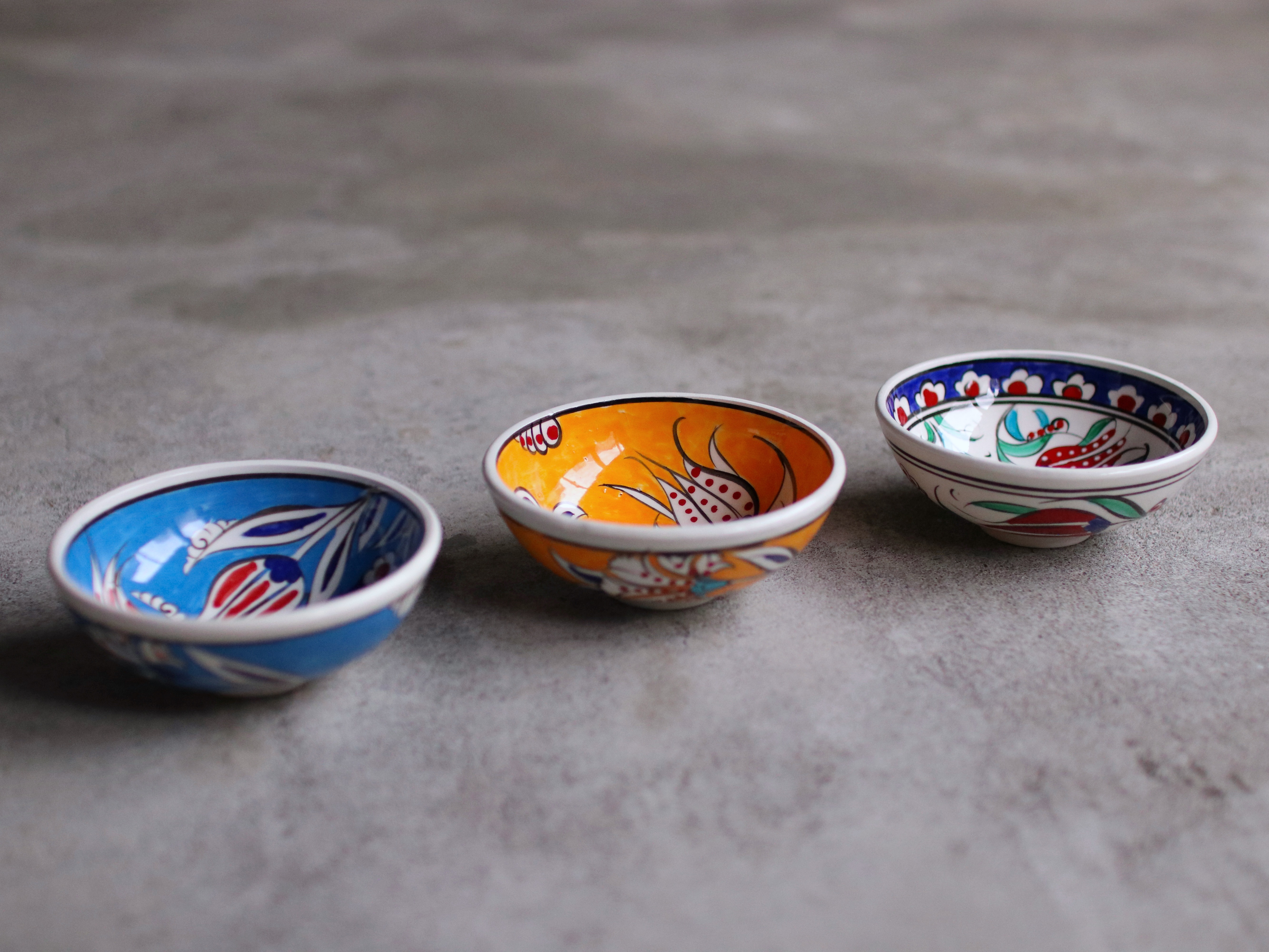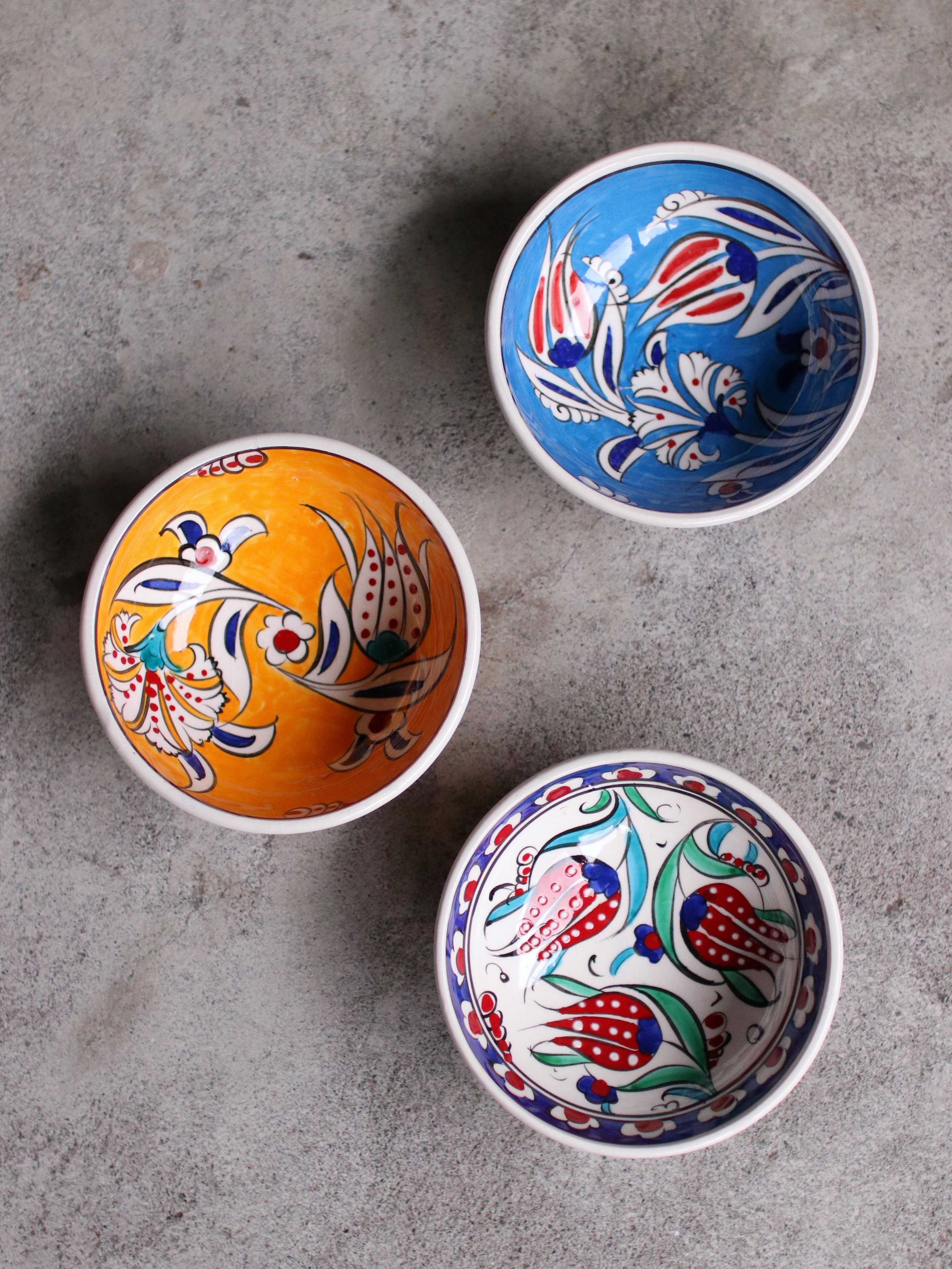 三款獨一無二的印度手繪陶瓷碗,精美的花卉圖案,鮮豔的黃色、藍色和白色色調,